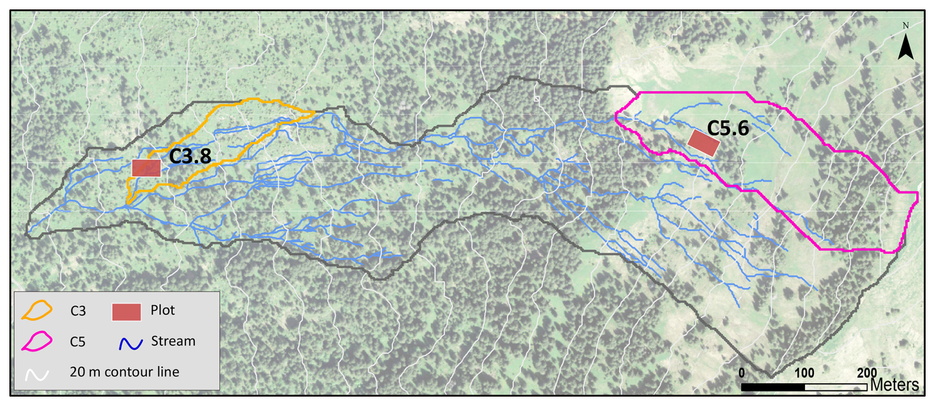 Figure 1Map of the Studibach catchment (black) with the location of subcatchment C3 (orange outline) and C5 (pink outline), and the runoff plots where the sprinkling and tracer experiments were done (red rectangles, not to scale). One plot (C3.8) is located in a natural clearing in the forest, while the other (C5.6) is located in a grassland that is used as a pasture in summer. The grey lines represent the 20 m contour lines and the blue lines the mapped stream network. Background image: Swisstopo SwissImage (Swiss Federal Office of Topography, 2019).