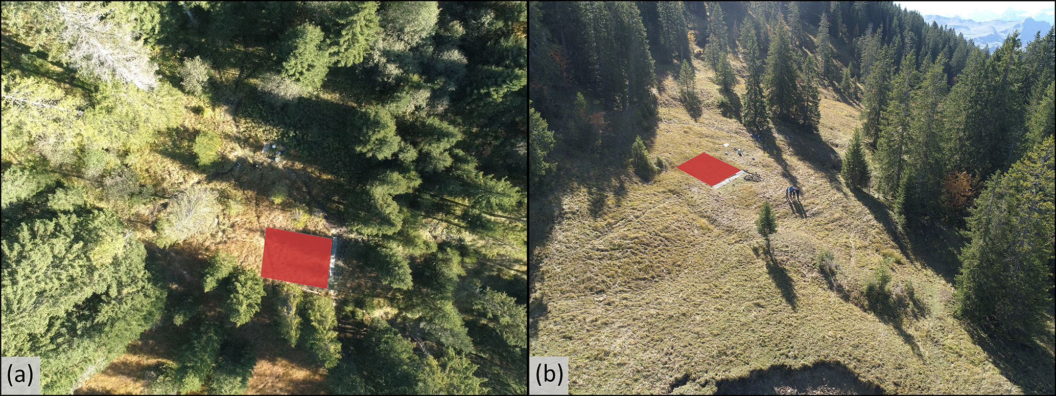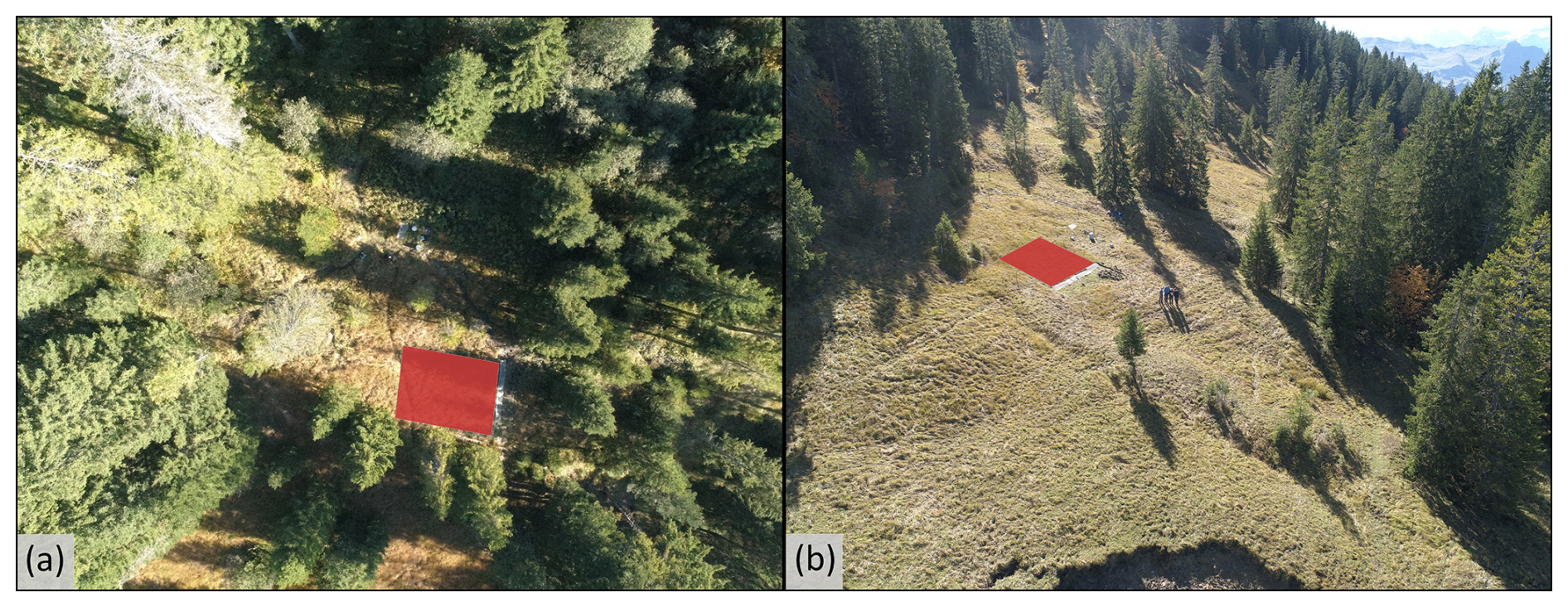 Figure 2Drone images of the plots in (a) the natural clearing in the open forest and (b) the grassland area. The location of the runoff plot areas is highlighted by the red trapezoids. For the location of the plots in the catchment see Fig. 1.