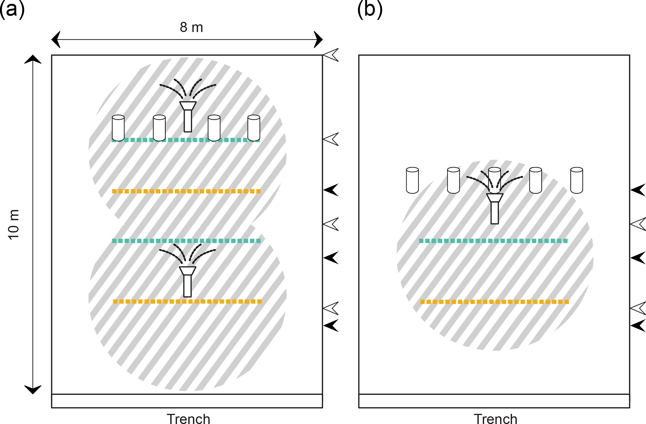 Figure 3Schematic overview of the tracer applications for the plots in the natural clearing (a) and in the grassland (b). Deuterium-labelled water (striped pattern) was applied to the surface via the sprinklers. NaCl (yellow) and uranine (green) were applied as lines at varying distances from the trench. NaBr was applied to the subsurface at a depth of 20 cm via piezometers. The location of the lines of the water pulses (black arrow heads) and blue dye (white arrow heads) are indicated on the side of the plots. The locations of the sprinklers are indicated with the sprinkler icons.