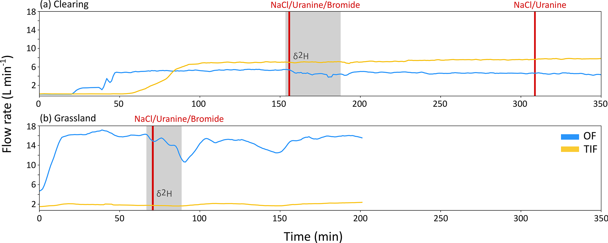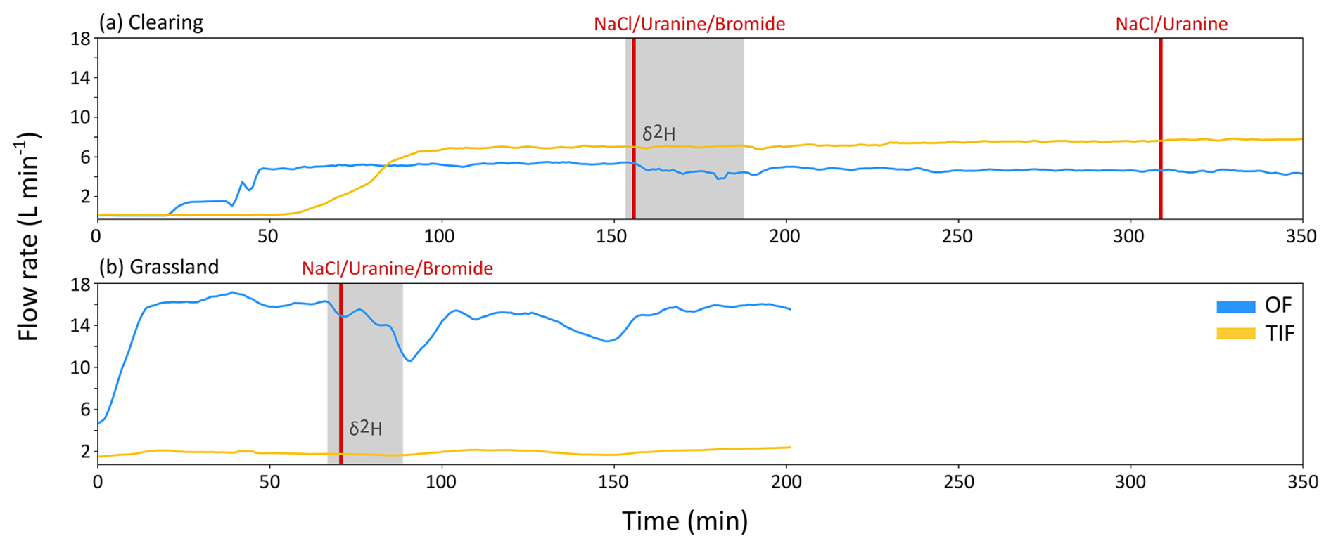 Figure 4Time series of the OF (blue) and TIF (orange) flow rates (L min−1) during the tracer experiments on the plot in the clearing (a) and the plot in the grassland (b). The period when deuterium-enriched water was applied is indicated by the grey shading. The times of the NaCl, uranine, and NaBr (bromide) tracer applications are indicated by the vertical red lines.