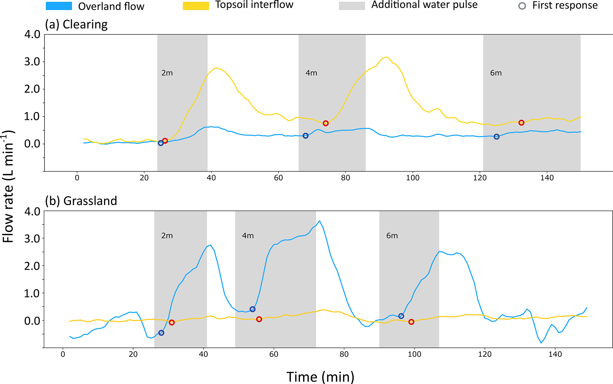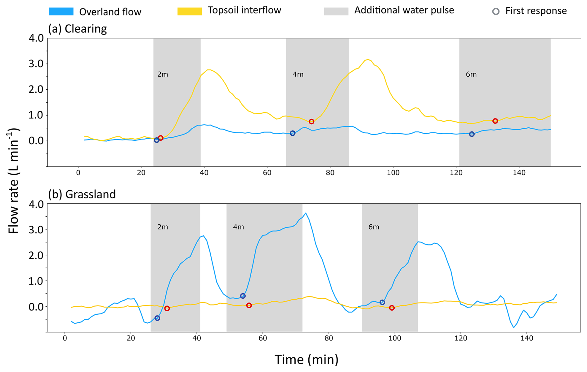 Figure 5Time series for the increase in flow rates above the average steady state flow rate for OF (blue) and TIF (orange) during the water pulse experiments for the plot in the clearing (a) and the plot in the grassland (b). The times during which the additional water pulses were added are indicated with the grey shading. The time of the first increase in the flow rate in response to the water pulse (used for the calculation of the celerity) is indicated with a circle (blue for OF and red for TIF).
