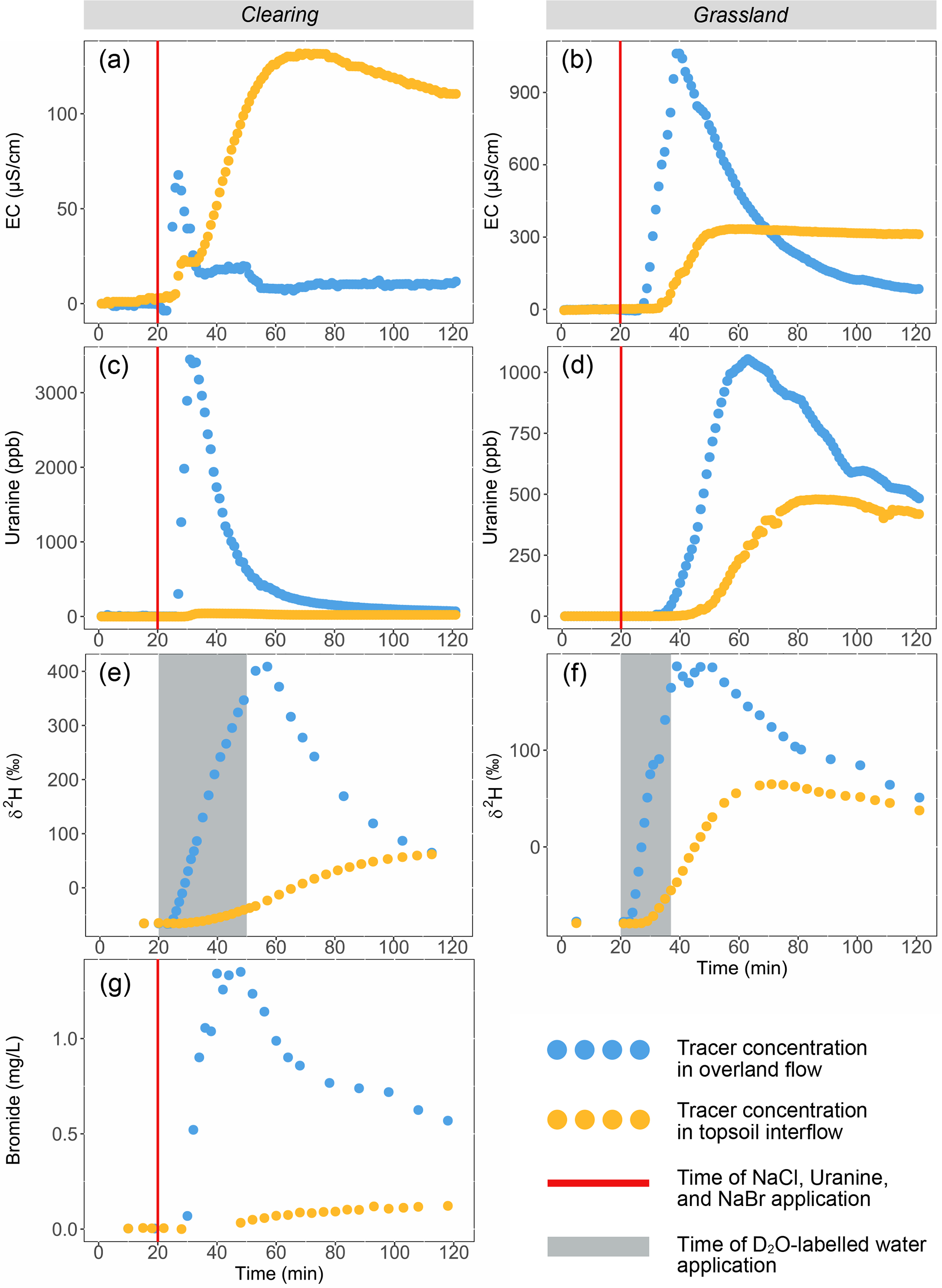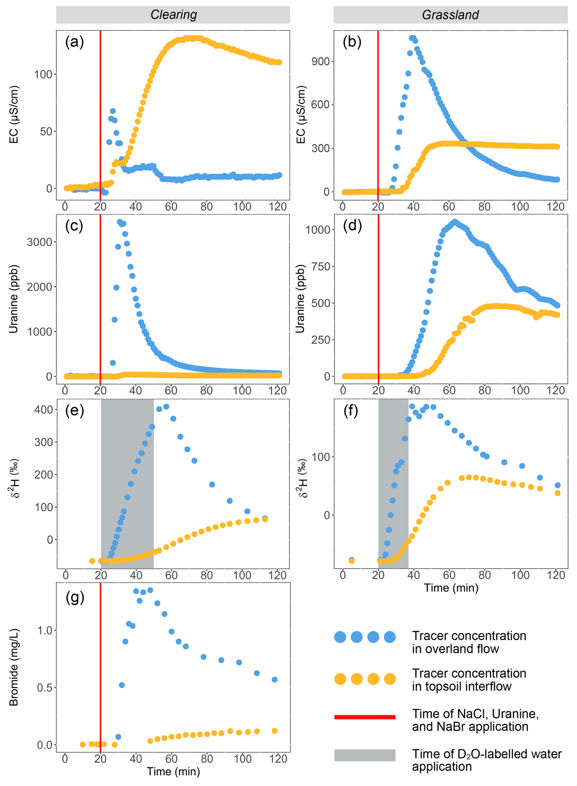 Figure 6Breakthrough curves for the first lines of NaCl (EC minus background EC; first row) and uranine (second row), the deuterium-labelled water added via the sprinklers (δ2H; third row), and the NaBr applied to the subsurface (fourth row) for OF (blue) and TIF (orange) for the plot in the natural clearing (left column) and the plot in the grassland (right column). The bromide concentrations for the grassland plot remained below detection limit and are therefore not shown. Note that time 0 in (a), (c), (e), and (g) corresponds to minute 138 in Fig. 4a, while time 0 in (b), (d), (f) corresponds to minute 50 in Fig. 4b. The vertical red lines indicate the time of NaCl, uranine, and NaBr application. The grey shaded areas indicate the time of the deuterium-labelled water application. For the responses for the second line tracer applications, see Fig. S1 in the Supplement.