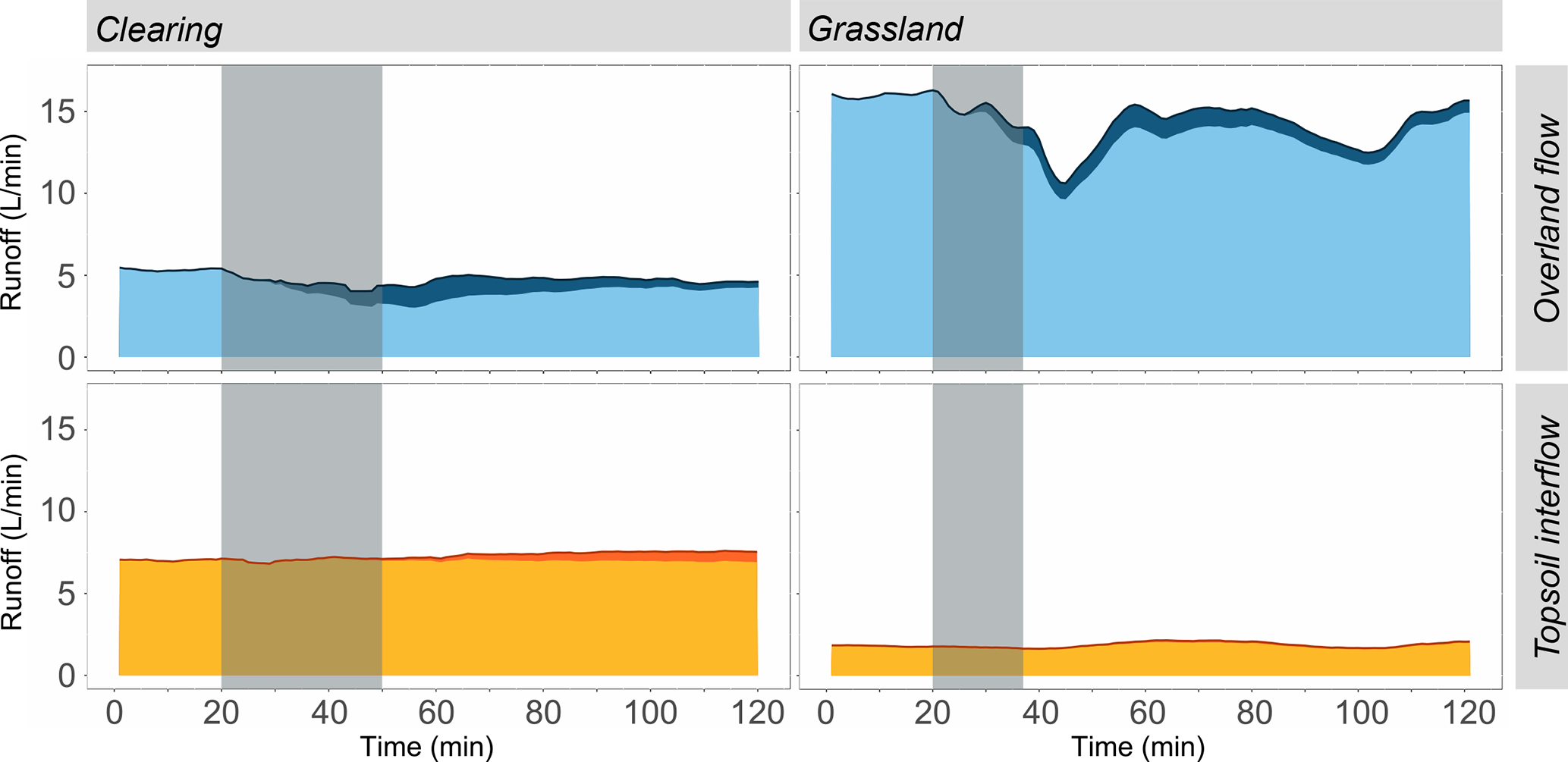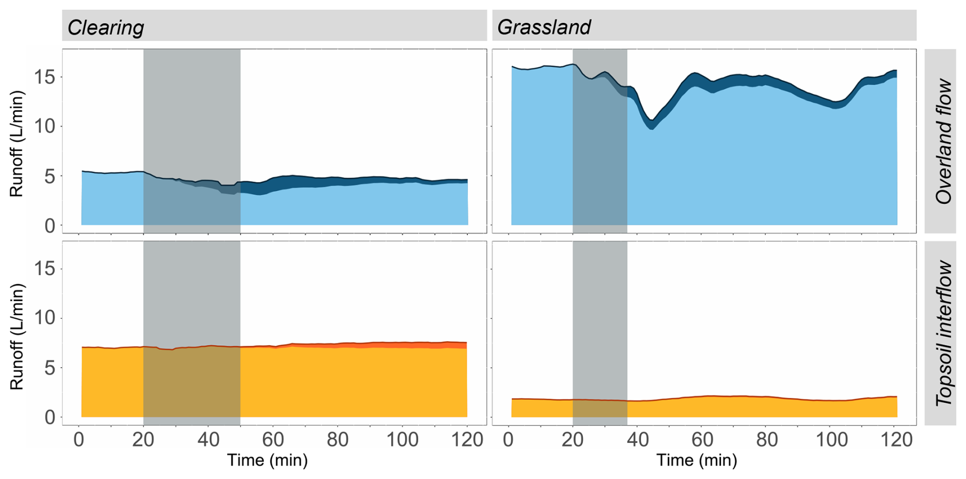 Figure 7Overland flow (top row, blue) and topsoil interflow (bottom panel, orange) rates, with the contribution of the deuterium-labelled water represented by the darker shades of blue and orange, respectively for the plot in the clearing (left) and the plot in the grassland (right). The grey shading indicates the time of the application of the deuterium-labelled water. Note that time 0 in the figure for the clearing (left) corresponds to minute 138 in Fig. 4a, and for the plot in the grassland (right) to minute 50 in Fig. 4b.
