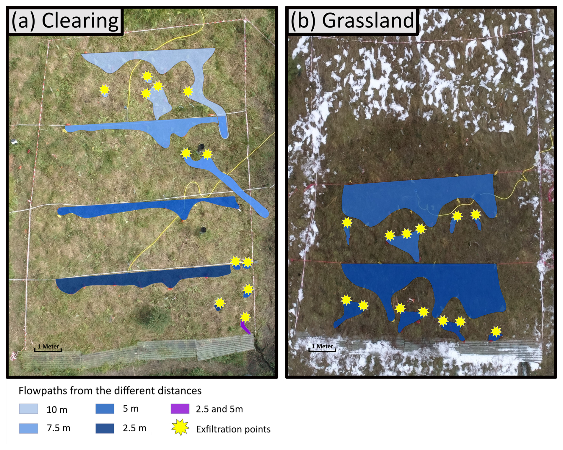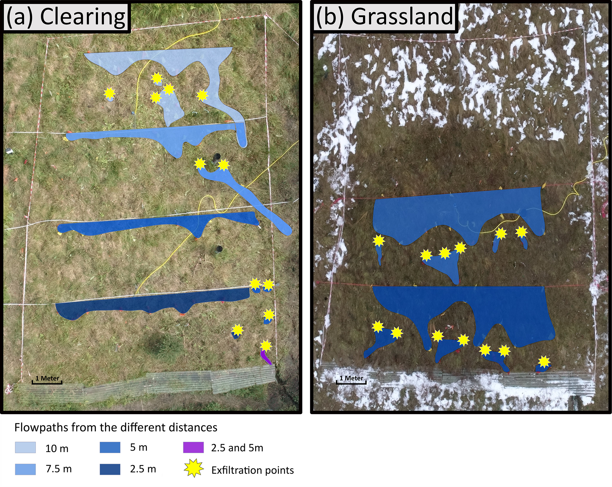 Figure 8Drone images of the plot the clearing (a) and the grassland (b), with polygons indicating the OF pathways on the surface (blue shading, with different colors representing the results for the dye applications at different distances from the trench), and the exfiltration points where the dye stained OF re-emerged at the surface (yellow stars). The violet shading indicates the flow path observed for the application at 2.5 m and at 5 m.