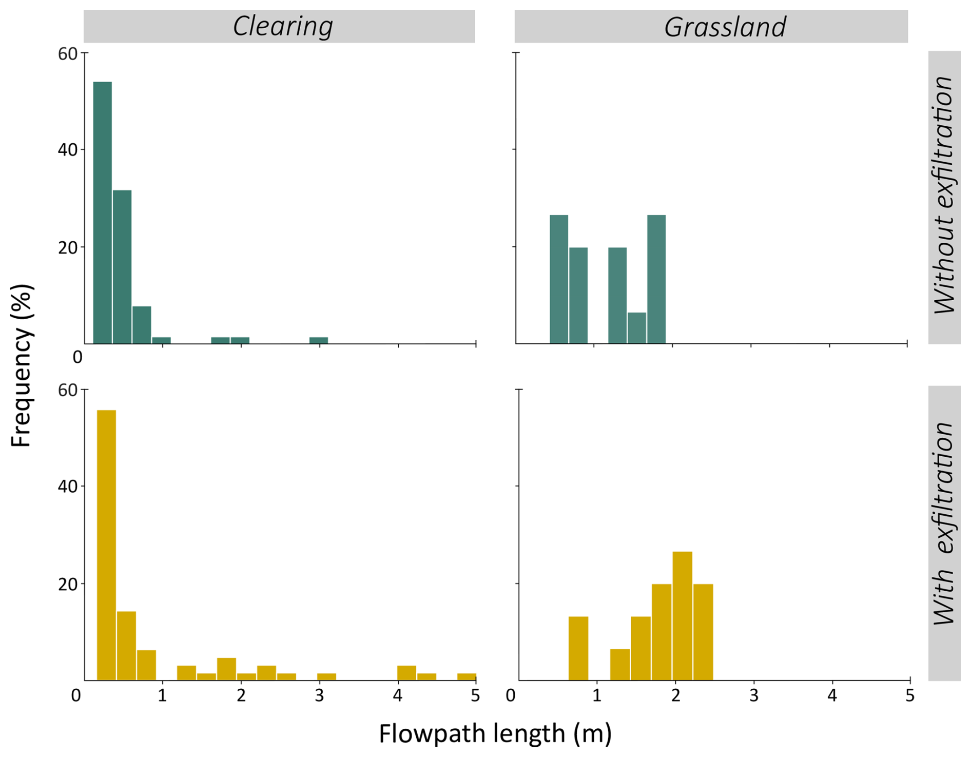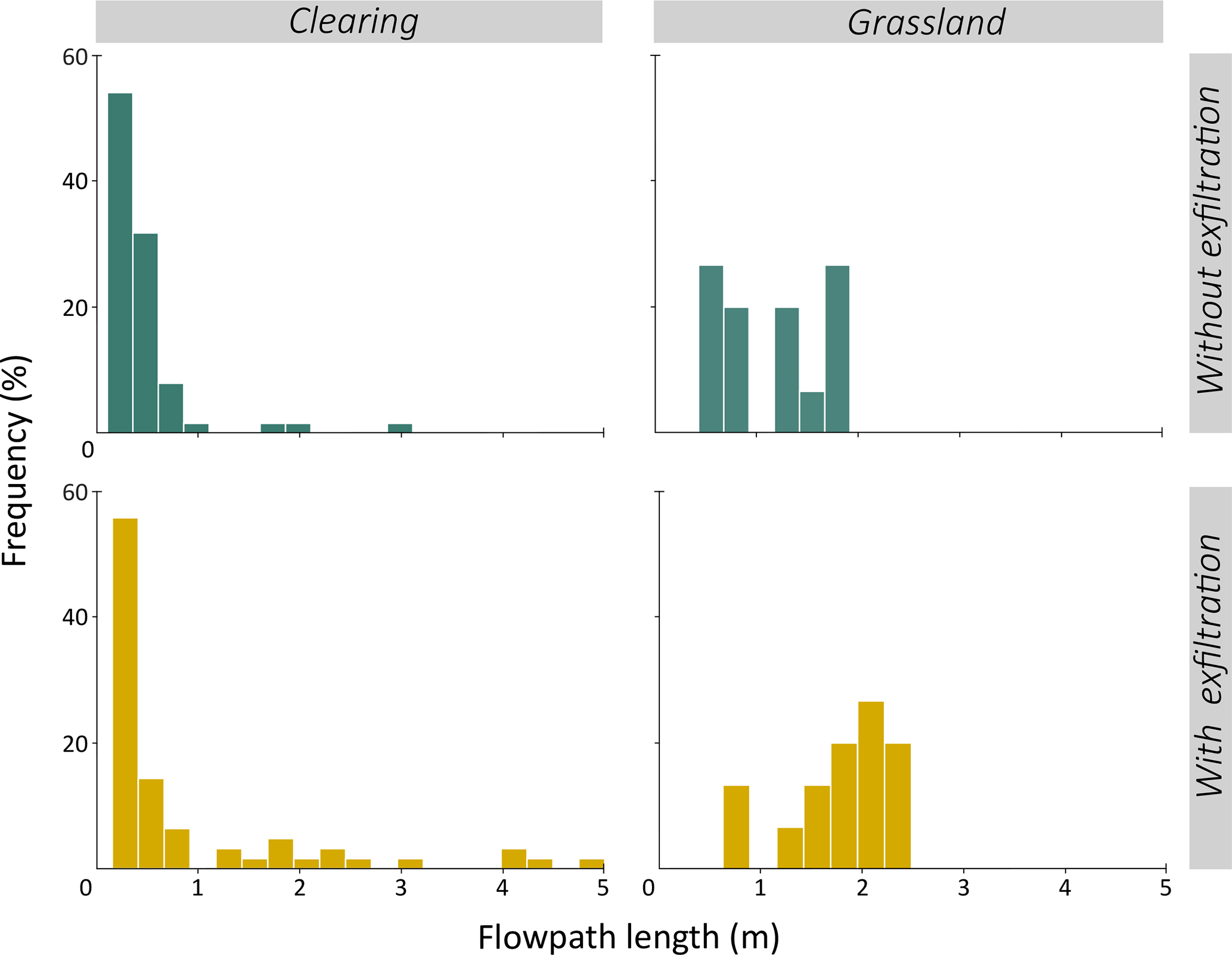 Figure 9Frequency distribution of the distances that OF travelled over the surface before infiltrating into the soil (top row), and the total flow path length when including the OF path of the exfiltrating dye stained water (bottom) for the experiments in the clearing (left) and the grassland (right).