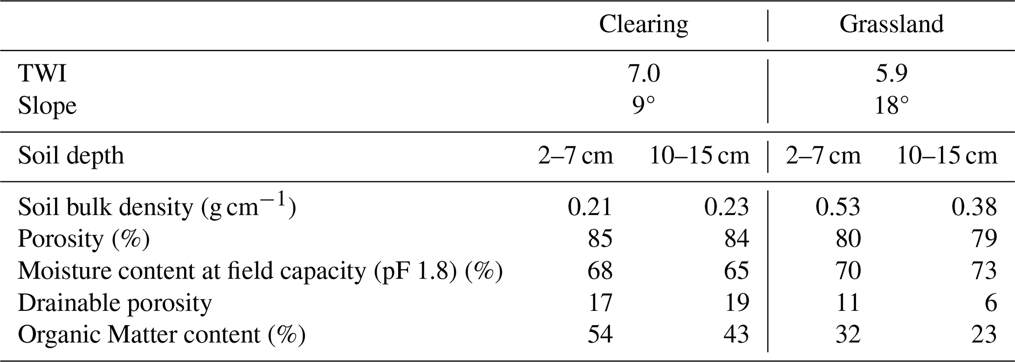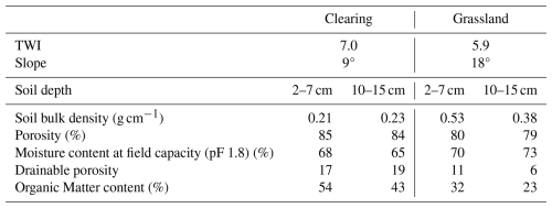 Table 1Overview of the plots and properties for the organic horizon (measured at 2–7 cm) and the topsoil (measured at 10–15 cm). The Topographic Wetness Index (TWI) is based on the calculations of Rinderer et al. (2014) for a 6 m smoothed Digital Elevation Model. The slope was measured in the field. The porosity, moisture content at field capacity and drainable porosity are based on measurements for a soil core with the Hyprop (METER Group, USA). The organic matter content is based on the loss on ignition.