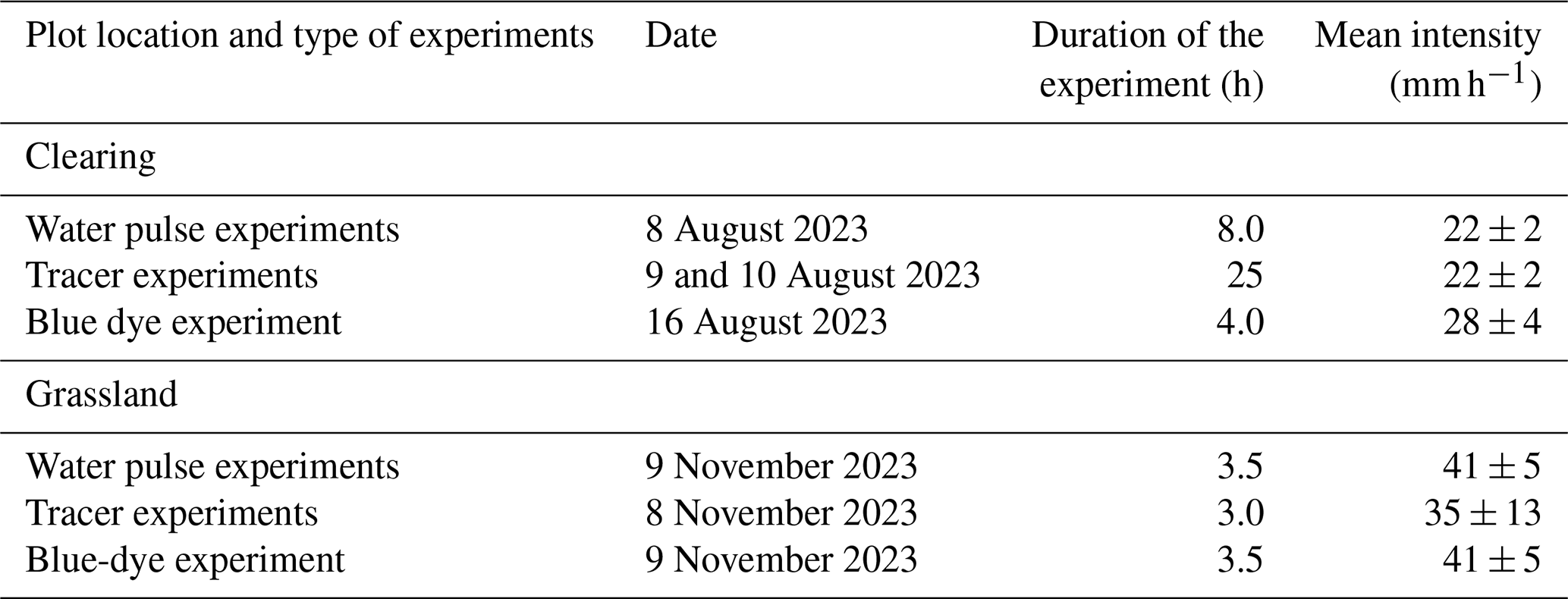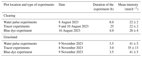 At both plots, rainfall was recorded with two tipping bucket rain gauges (Davis Instruments Corp. with an Odyssey data logger; Dataflow Systems; 0.2 mm resolution) installed at 4.0 and 6.5 m from the trench (Fig. 3). Additionally, we installed five rain collectors (funnel diameter: 100 mm) to determine the uniformity of the applied rainfall. The mean rainfall intensity was 24 mm h−1 for the experiments in the clearing and 39 mm h−1 for the experiments in the grassland (Table 2). These mean intensities correspond to intense rainfall events that occur on average one time per year for 24 mm h−1, and every ten years for 39 mm h−1 (maximum rainfall intensity recorded: 50 mm h−1), based on 38 years of hourly precipitation data from the Erlenhöhe meteorological station, located 500 m from the Studibach outlet. As a daily rainfall amount of 100 mm occurs on average only every three years, the total amount of water applied over the experiments is extreme for the Alptal. Nevertheless, during natural rainfall, our sites frequently become near saturated and produce significant lateral flow (Gauthier et al., 2025). Variations in mean intensity for the experiments in the clearing were attributed to small stones that partially obstructed the hose. For the experiments in the grassland, there were occasional issues with the pump or its power supply, leading to larger variations in the applied rainfall intensity.