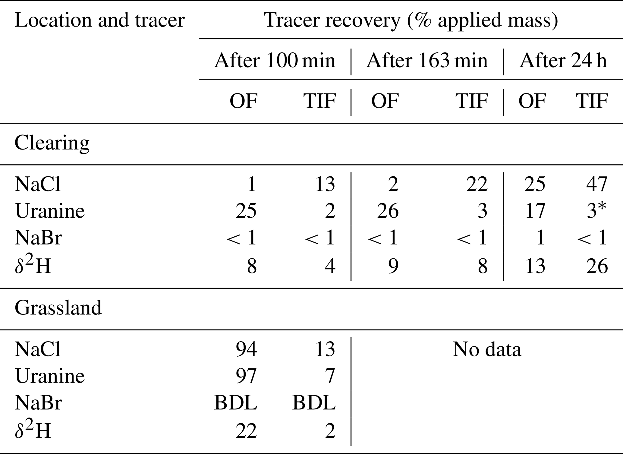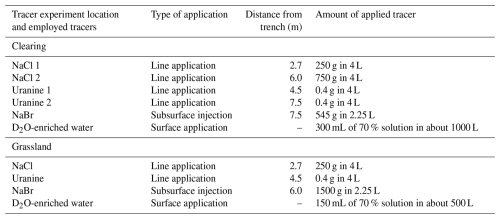Table 6Cumulative tracer recovery as percentage of the applied mass for each tracer used in the experiments for the plot in the clearing and the plot in the grassland. For the plot in the clearing, the second lines of NaCl and uranine were applied 163 min after the first applications. Therefore, the values reported for 100 and 163 min include only the recovery of the first tracer application, while the values reported for 24 h represents the recovery from both applications. Because the total applied mass increased with the second application and the recovery for the second line (applied further upslope) was less than for the first line, the cumulative recovery after 24 h expressed as a percentage of the total applied mass is less than after 163 min. Some of the tracer applied to the upper parts of the plot in the clearing likely left via an outflow on the side of the plot (see Sect. 4.4). This affected the recovery of NaCl 2, uranine 2, NaBr, and deuterium-labelled water that were applied upslope from this outflow. BDL stands for “below detection limit”.