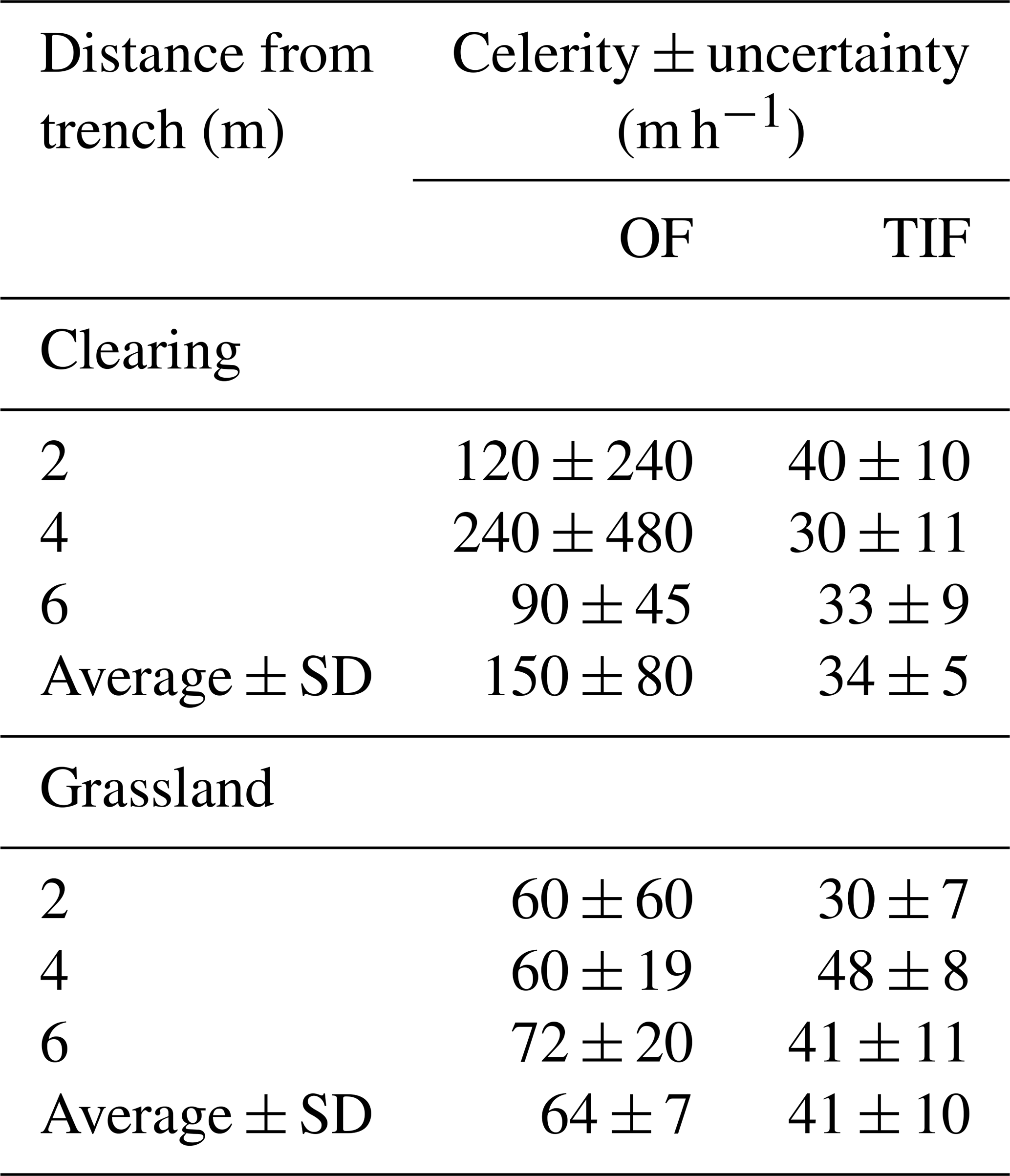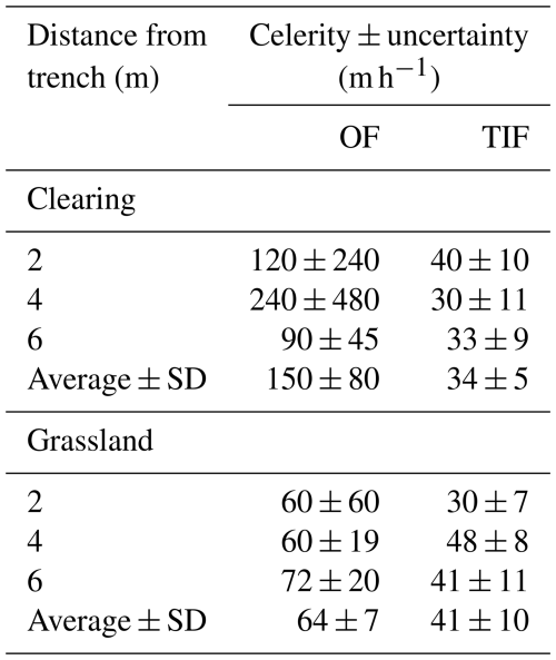 Table 4Calculated celerity ± the estimated uncertainty for the water pulses applied at different distances from the trench for overland flow (OF) and topsoil interflow (TIF) for the plots in the clearing and the grassland, as well as the average value ± standard deviation (SD) for each plot. The uncertainty is based on an uncertainty of 2 min for the timing and an uncertainty of 0.1 m for the distance.