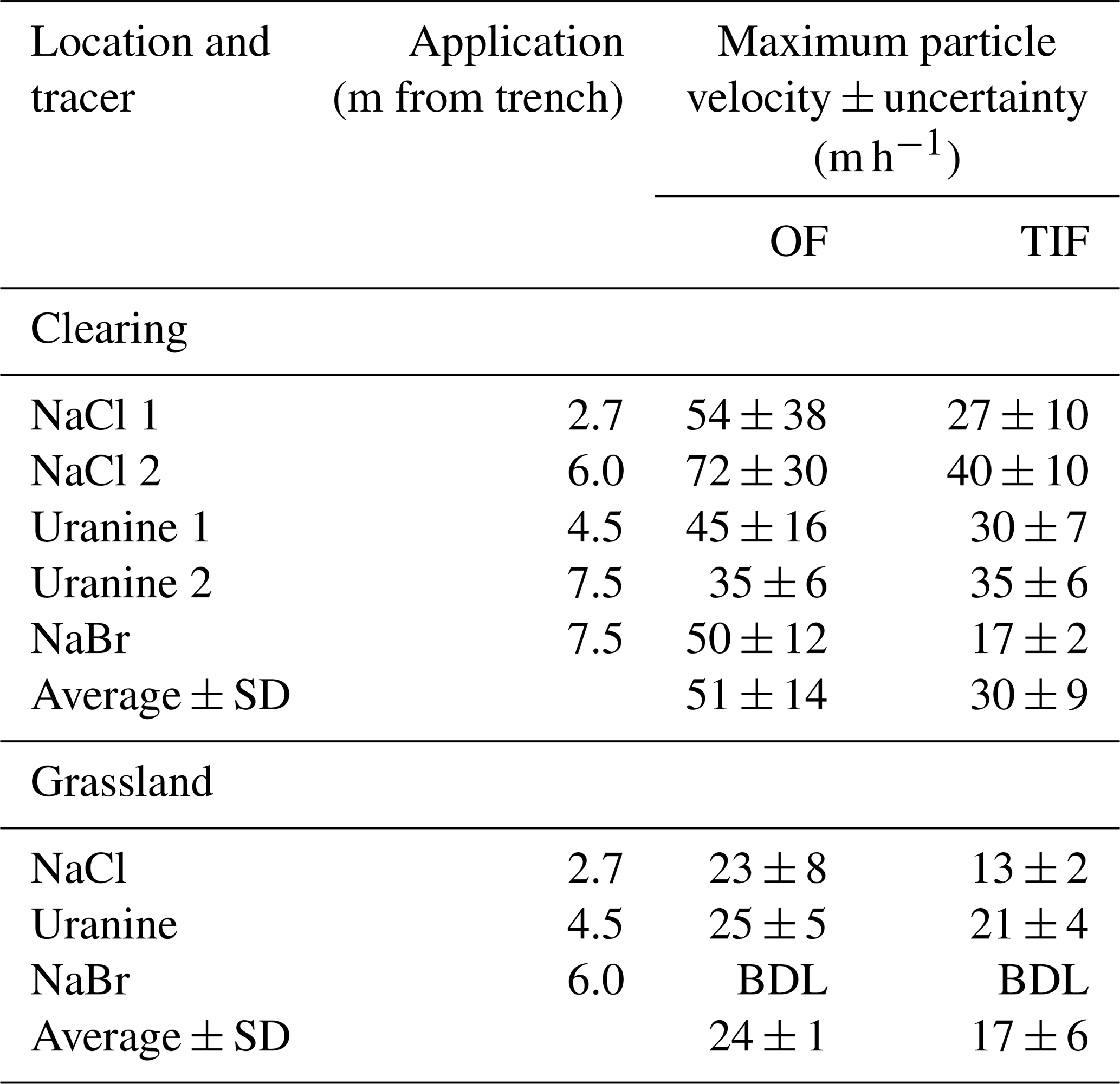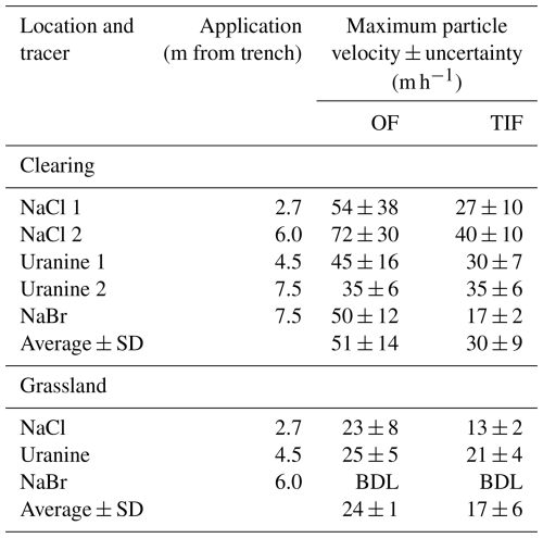 Table 5Maximum particle velocities ± the estimated uncertainties for the tracers applied at different distances from the trench for overland flow (OF) and topsoil interflow (TIF) for the plots in the clearing and the grassland, as well as the average ± standard deviation (SD) for each plot. The uncertainty is based on an uncertainty of 2 min for the timing and an uncertainty of 0.1 m for the distance. BDL stands for “below detection limit”.