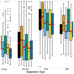 Figure 6Portion of fast transpiration (f) values for the 648 watersheds classified into six vegetation types. ENF: evergreen needleleaf forest, DBF: deciduous broadleaf forest, MF: mixed forest.