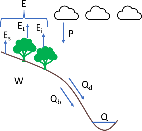 Figure 1Two stage partitioning of annual precipitation. E: evapotranspiration; Es: soil evaporation; Ei: interception evaporation; Et: transpiration; P: precipitation; W: soil wetting; Qb: baseflow; Qd: direct runoff; Q: total runoff.