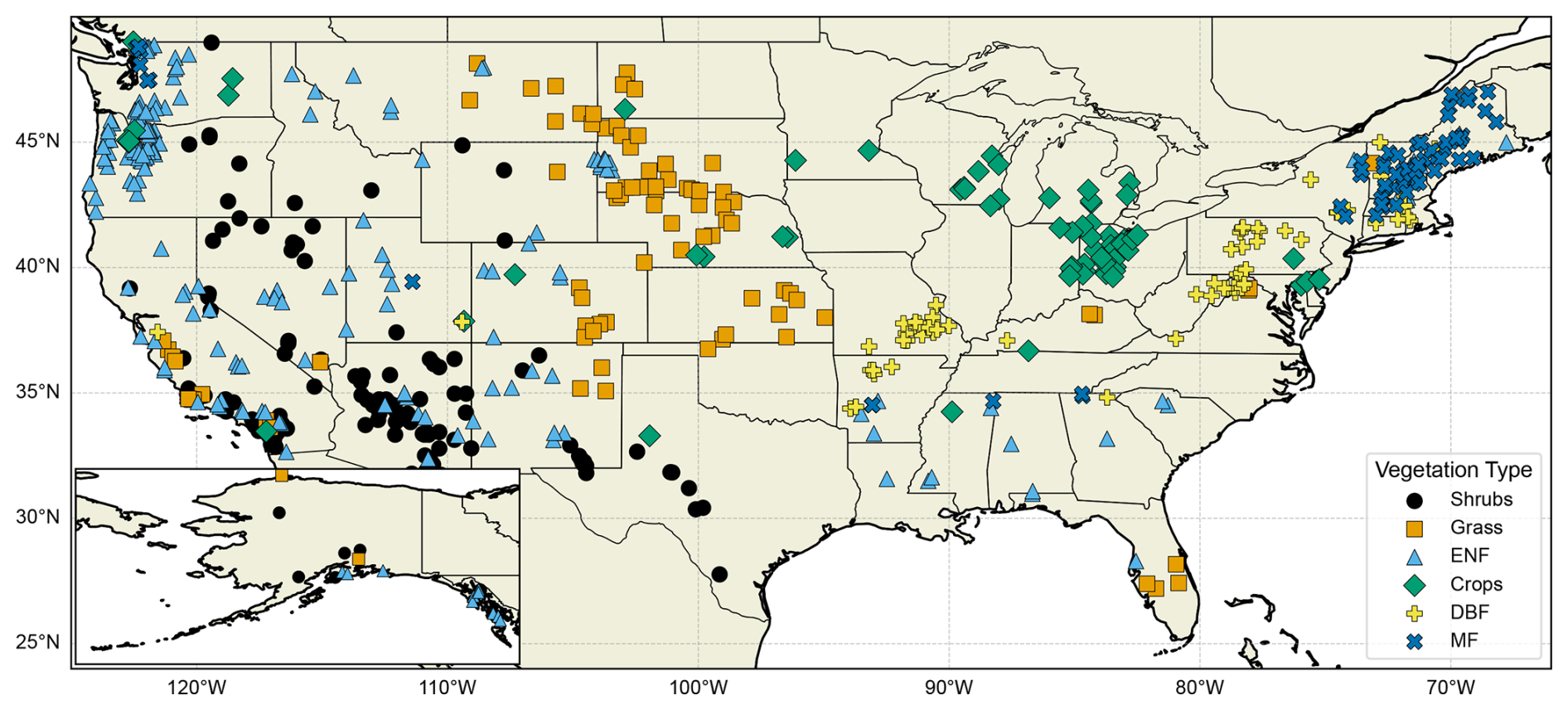 Figure 2648 watersheds in the US, categorized into six vegetation types; crops, grass, shrubs, evergreen needleleaf forest (ENF), deciduous broadleaf forests (DBF), and mixed forests (MF). The inset map at the bottom left shows watersheds in Alaska.