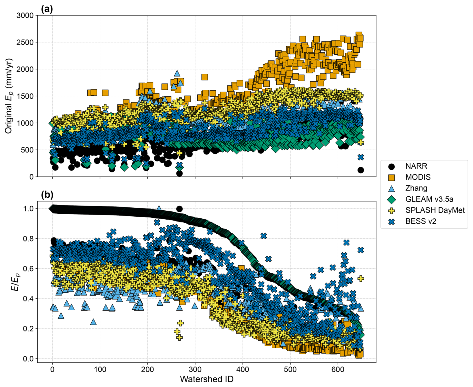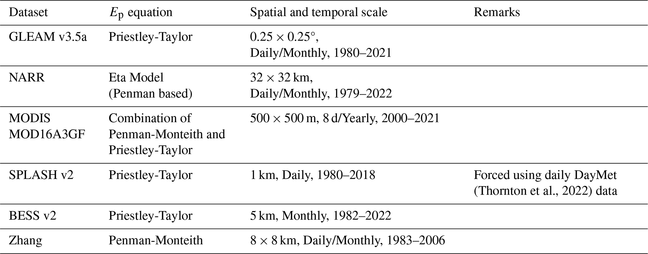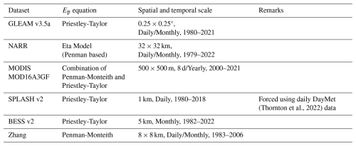 Numerous Ep data products are available that satisfy our study regions and time period requirements, posing a question as to which one should be selected – as each has its own strengths. To address this question, we examined six widely used Ep data products and assessed their impact on the estimation of Et/E ratios. These data products were selected because they are (1) widely used within the hydrological and ecological communities, (2) associated with a wide range of spatial resolutions, and (3) derived using different methods. The six Ep datasets are the Global Land Evaporation Amsterdam Model (GLEAM v3.5a, Martens et al., 2017), the Moderate Resolution Imaging Spectroradiometer (MODIS MOD16A3GF) product (Running et al., 2022), the Ep dataset from Zhang et al. (2010), the North American Regional Reanalysis (NARR, Mesinger et al., 2006), the Simple Process-Led Algorithms for Simulating Habitats (SPLASH v2.0, Sandoval et al., 2024) , and the Breathing Earth System Simulator (BESS v2, Li et al., 2023). Details of these six products are provided in Table 1.