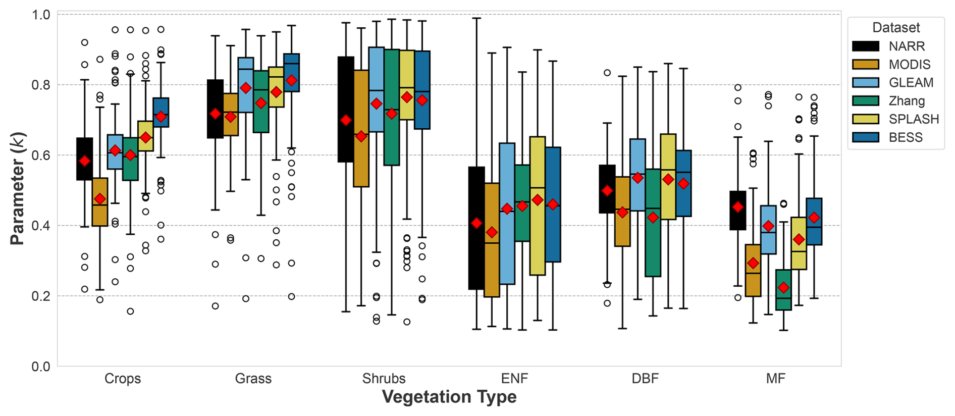 Figure 5k values for the watersheds using data from six datasets: NARR, MODIS, Zhang et al. (2010), GLEAM after rescaling, SPLASH v2, and BESS v2. Note that ENF, DBF, and MF represent, respectively, evergreen needle-leaf forest, deciduous broadleaf forest, and mixed forest in the figure.