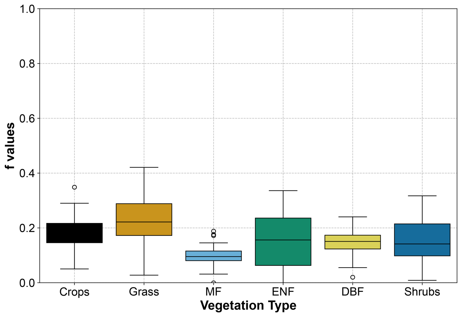 Figure 6 shows the values of the f parameter for 648 watersheds classified into six vegetation types. The highest f value is observed in grass, which can be explained by their shallow rooting depths causing higher portions of fast transpiration. The lowest f values are observed in forests due to their deeper rooting system, which provides access to deeper soil moisture, reducing the portion of fast transpiration.