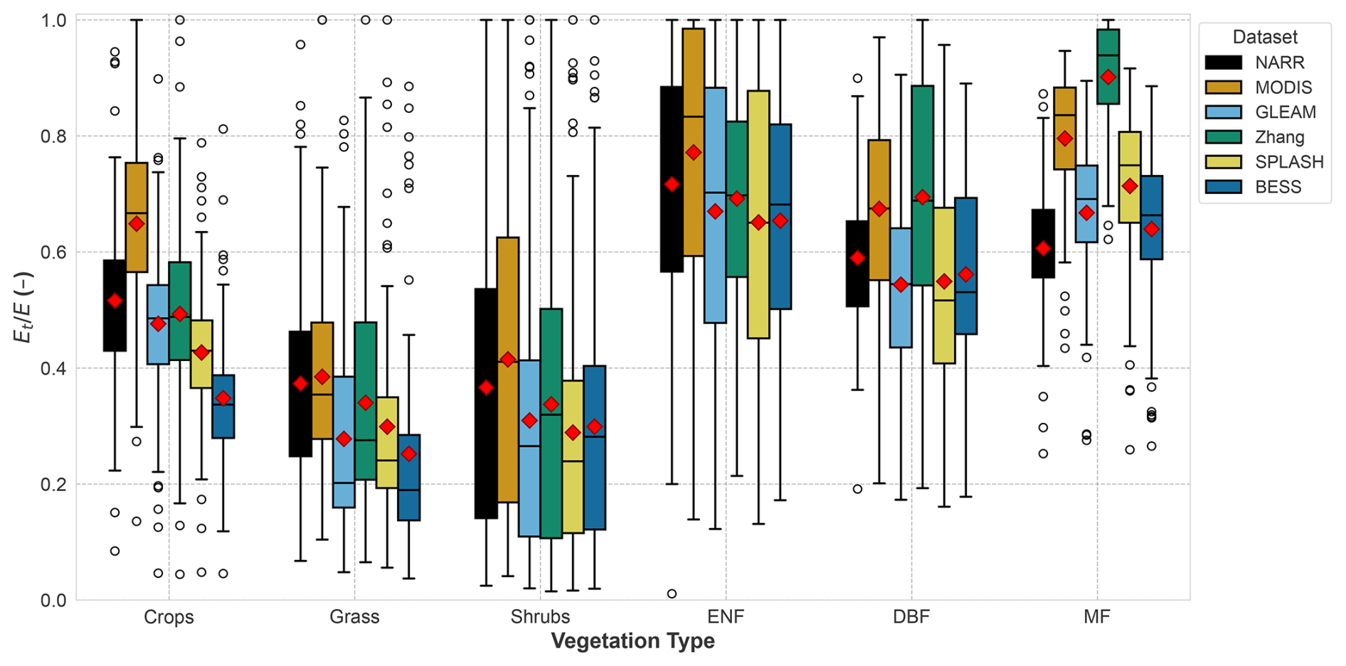 Et/E ratios are shown in Fig. 7 and Table 4. Overall, the trend is consistent among the six datasets. Grass and shrubs have the lowest Et/E values, with mean Et/E in the range of 0.25–0.41. Crops have higher mean Et/E ratios, with NARR, Zhang, and GLEAM averaging around 0.5, while MODIS shows a higher crop mean Et/E of around 0.65. BESS has the lowest crop Et/E with a value of 0.35. All datasets have similar forest Et/E trend, with lowest mean Et/E for DBF (0.54–0.69), followed by ENF (0.65–0.77). The highest mean Et/E is exhibited for MF (0.61–0.90).