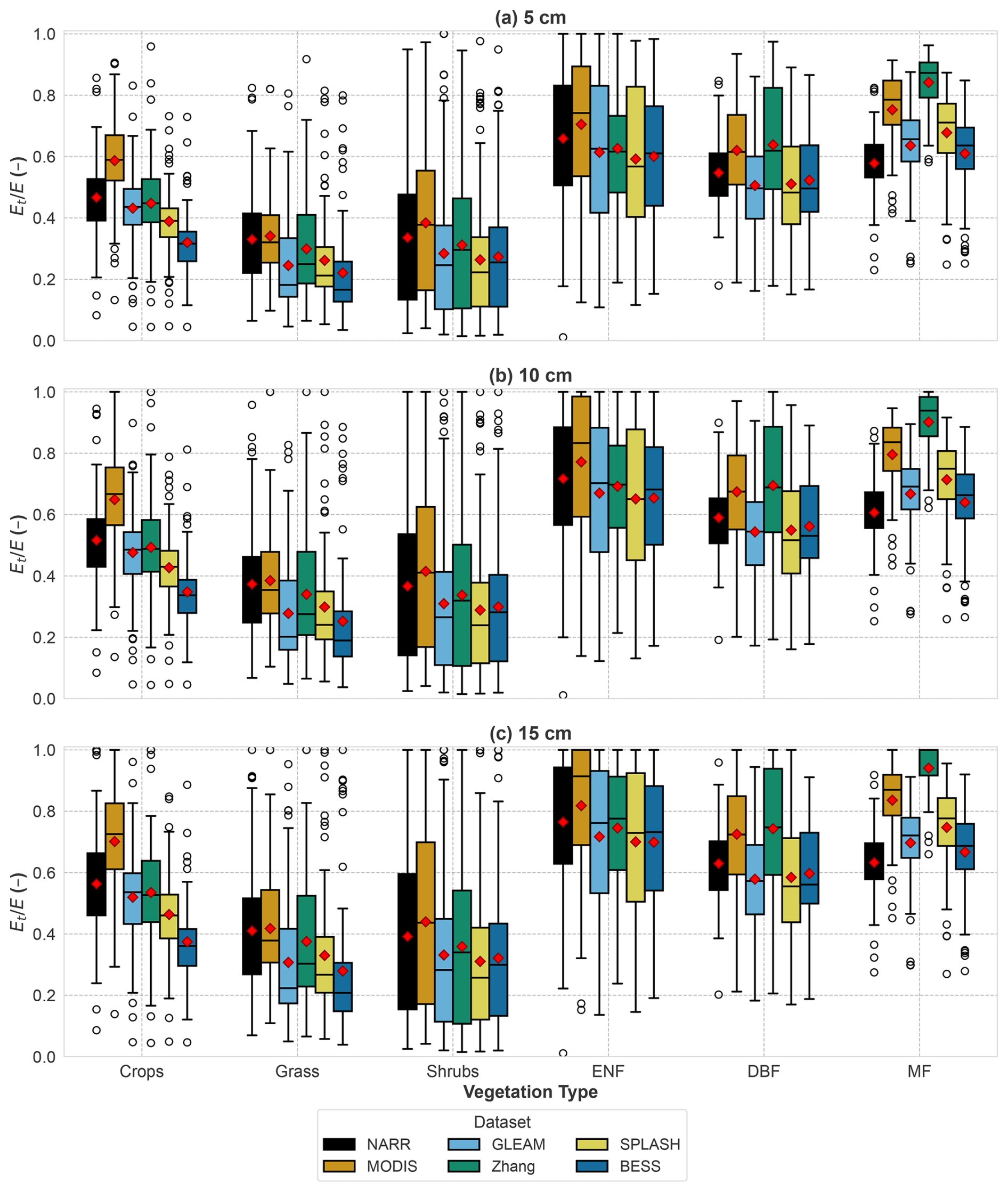 The literature shows variation in how the depth of fast transpiration is defined. For example, Abolafia-Rosenzweig et al. (2020) used the top 5 cm to estimate transpiration from the surface soil layer. Wang et al. (2021) indicated that evapotranspiration occurs most rapidly from the top 10 cm of soil, with deeper layer responding more slowly. Similarly, Zhang et al. (2022) reported that rapid soil moisture responses to rainfall were concentrated in the top 5–10 cm, suggesting that fast transpiration is likely driven by increased soil moisture within this layer. By contrast, Abeshu and Li (2021) used 50 cm as the depth of the rapid response. We consider 50 cm to be an overestimation, as for some vegetation types (e.g., grasses) this depth may encompass nearly the entire rooting zone. Based on this evidence, we adopted 10 cm as the representative depth for fast transpiration. In addition, we conducted a sensitivity analysis in Sect. 4.4 to quantify the effect of this depth choice on the Et/E values.