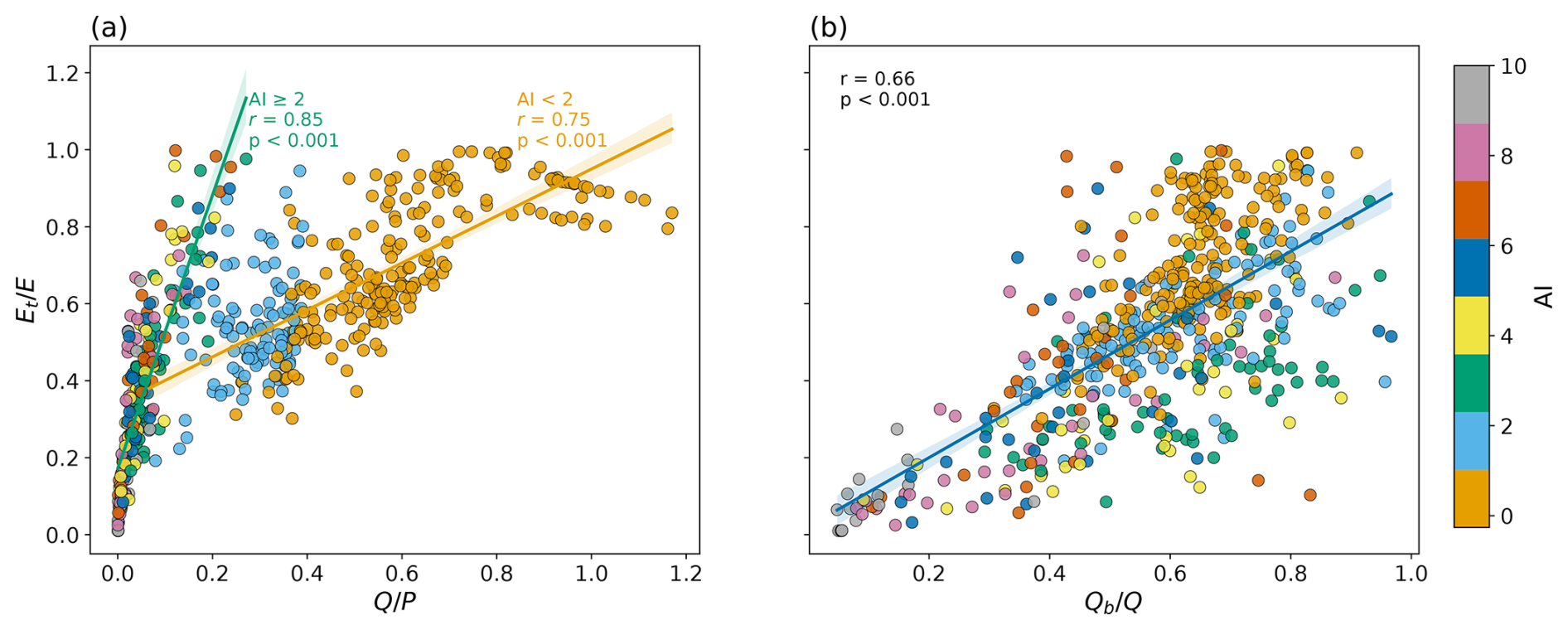 In Fig. 9b a non-linear positive relationship is depicted between the mean Et/E and Qb/Q (baseflow ratio). The baseflow ratio serves as an indicator of soil water availability, as higher baseflow typically corresponds to increased soil moisture content (Hurkmans et al., 2008). Consequently, a positive correlation between Et/E and the baseflow ratio is anticipated. Notably, the majority of arid catchments cluster in the low Qb/Q and low Et/E region, while transitioning toward wetter catchments naturally augments both Qb/Q and Et/E.