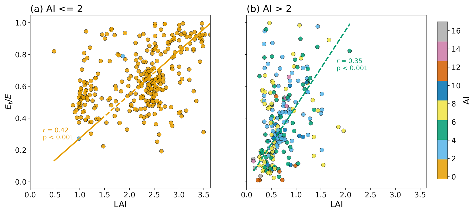 The leaf area index (LAI), representing the leaf area per unit ground area, reflects the combined influences of leaf size and canopy density. As shown in Fig. 10, LAI appears to exert some influence over evapotranspiration partitioning. Arid watersheds show lower LAI values, and Et/E ratios increase non-linearly with LAI. However, as watersheds transition toward higher humidity levels, their LAI and Et/E ratios increase non-linearly, albeit at different rates. In arid regions, plants tend to reduce their leaf area to mitigate water loss (Chaves et al., 2003) decreasing both LAI and Et/E – a direct consequence of high aridity. This suggests that aridity plays a role in regulating Et/E. Figure 10 illustrates a complex relationship between LAI and Et/E, characterized by substantial scatter. Our findings align with previous studies indicating diverse dependence of Et/E on LAI. For instance, LAI has been shown to provide a control on E partitioning (Li et al., 2019; Wang et al., 2014; Wei et al., 2017), but that effect varies from one study to another. Wang et al. (2014) showed that LAI has a non-linear relationship with Et/E during the growing season, whereas Li et al. (2019) showed a weak linear relationship between mean growing season LAI and mean annual Et/E across sites, with the Et/E and LAI relationship within the same site being non-linear. Additionally, Cao et al. (2022) showed a non-linear positive relationship between annual Et/E and LAI.