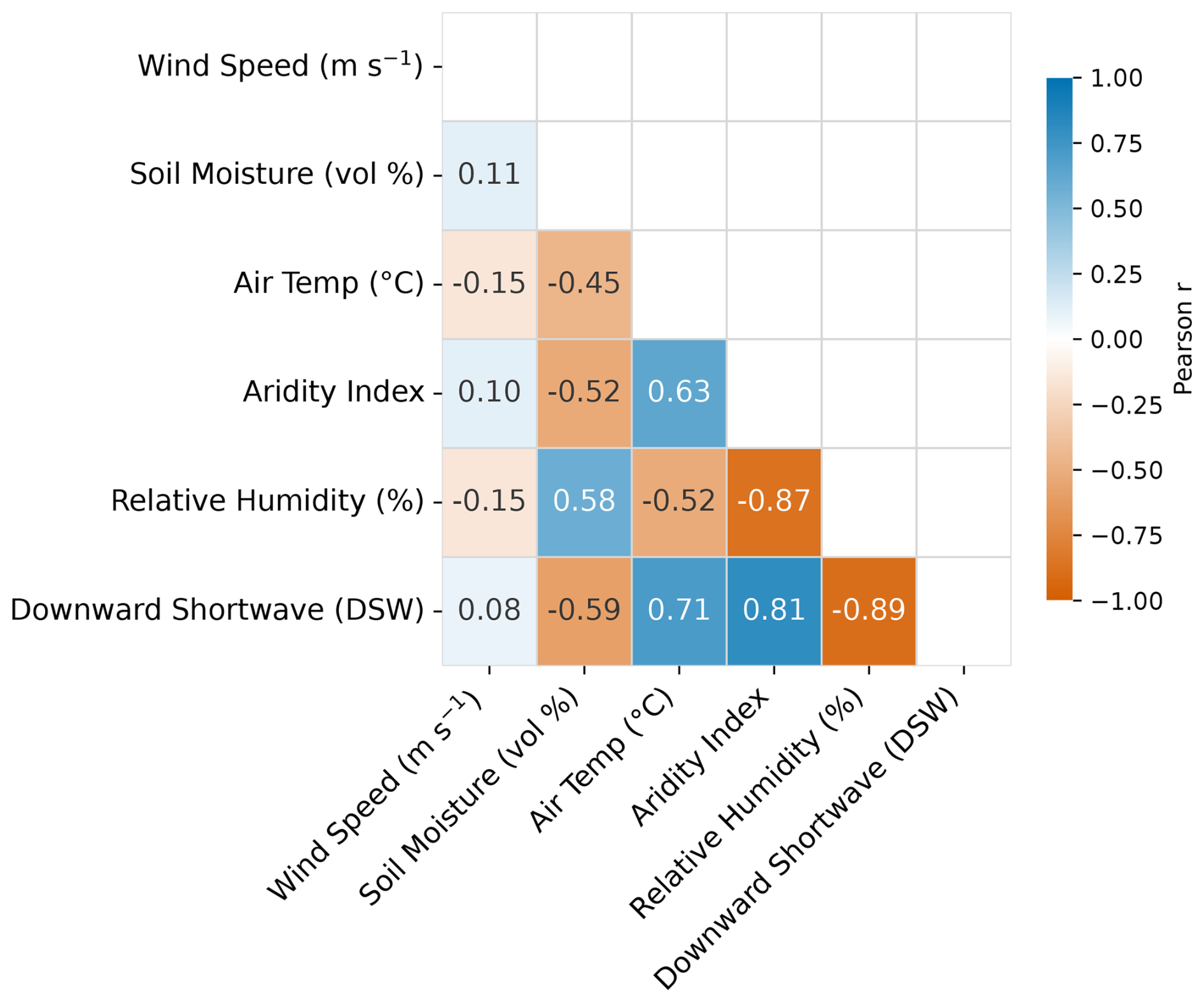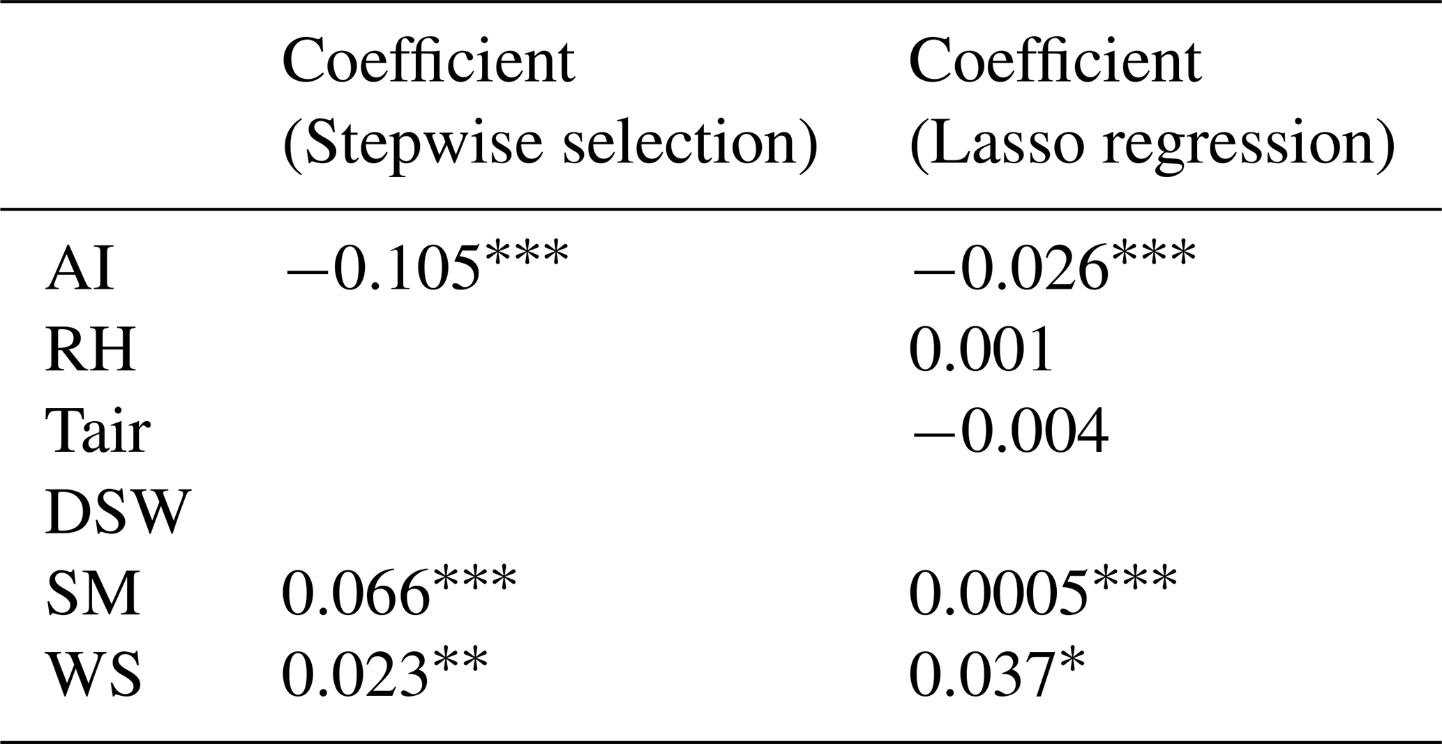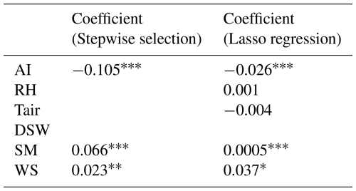 We explore the effect of six environmental factors on the mean Et/E ratios. They are aridity index (AI), relative humidity (RH), air temperature (Tair), downward shortwave radiation (DSW), soil moisture, and wind speed (WS). These factors were derived from the NARR dataset, and the Et/E ratios were calculated based on the same dataset. Since some of these environmental variables are highly correlated (as shown in Fig. 11), we first perform variable selection using stepwise regression and Lasso regression to identify those that are strongly correlated with each other. Stepwise regression aims to select a subset of variables that provide the best prediction with minimum redundancy, while Lasso regression adds a penalty term to reduce the coefficients of insignificant variables. Both methods resulted in the elimination of downward shortwave radiation, while stepwise selection additionally eliminated relative humidity and air temperature. Table 6 shows the coefficients of the environmental variables and their significance for both stepwise and Lasso regression. Although the significance test shows that air temperature and relative humidity have an insignificant impact on the Lasso regression, while the aridity index, soil moisture, and wind speed are significant (Table 6), they are still included because they marginally contribute to the model's predictive power. Additionally, they represent independent and observable dimensions, distinct from the other three significant environmental variables.
