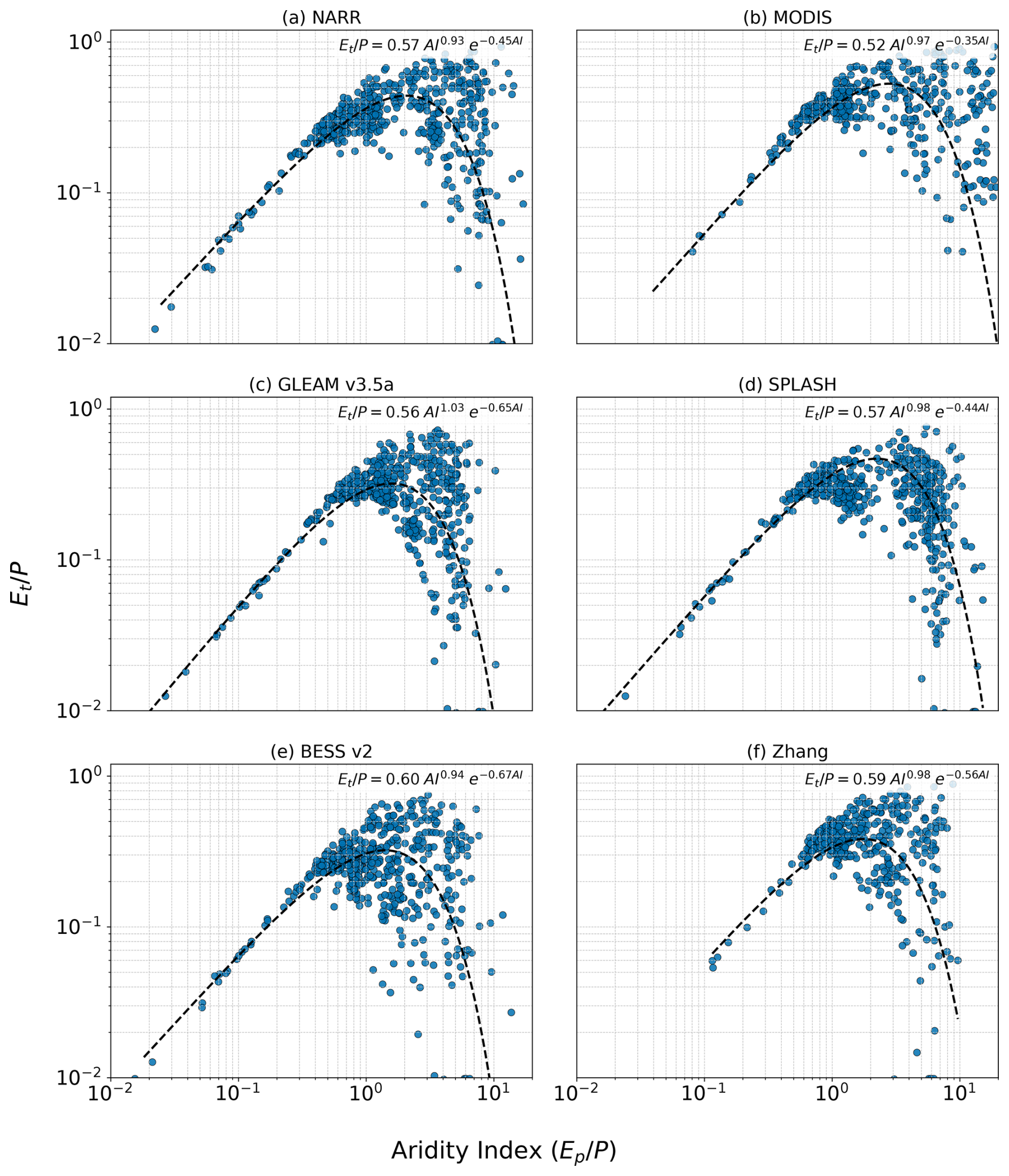 The relevant data were collected for 648 watersheds and aggregated to the annual timescale. The dominant vegetation type was determined for each watershed from the ESA CCI land cover data, and watersheds were classified into six vegetation types: crops, grass, shrubs, evergreen needleleaf forest (ENF), deciduous broadleaf forest (DBF), and mixed forest (MF). We assume each watershed has a single mean long-term Et/E value. For each dataset, due to the different time coverage of the datasets and the streamflow gauges, we filtered the watersheds to include only those that have available data for at least 10 years. We used optimization to find k. We then performed additional filtering for each dataset to remove watersheds with KGE values less than zero. Using the filtered watersheds, we calculated Et/E based on estimated k and f together with the other variables. The final number of watersheds associated with each dataset used in this study, after filtering, is shown in Table 2.