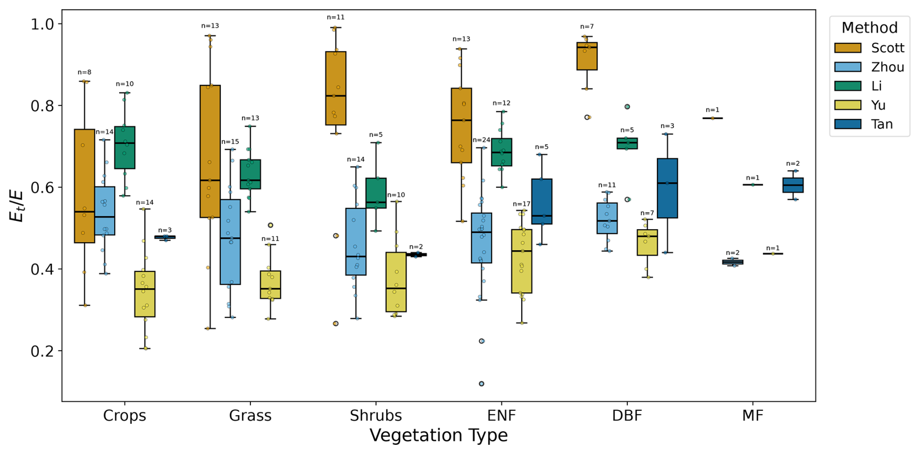 Differences in study scale may hinder the comparison with other studies, since our method estimates Et/E at the watershed scale, while other studies are based at a plot-scale (field/eddy covariance-based methods) or grid scale (models and remote-sensing methods). Factors affecting watershed scale Et/E include the possible presence of secondary vegetation within the watershed and the possible sparseness of the primary vegetation and presence of bare areas which can increase soil evaporation and reduce Et/E, especially for shrublands. Therefore, this method has the advantage of providing a realistic watershed Et/E ratio that accounts for multiple vegetation types and sparseness in vegetation distribution. Consistent results across different datasets underscore the reliability of our new method, irrespective of the data product employed (see Fig. 7 and Table 4).