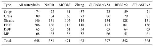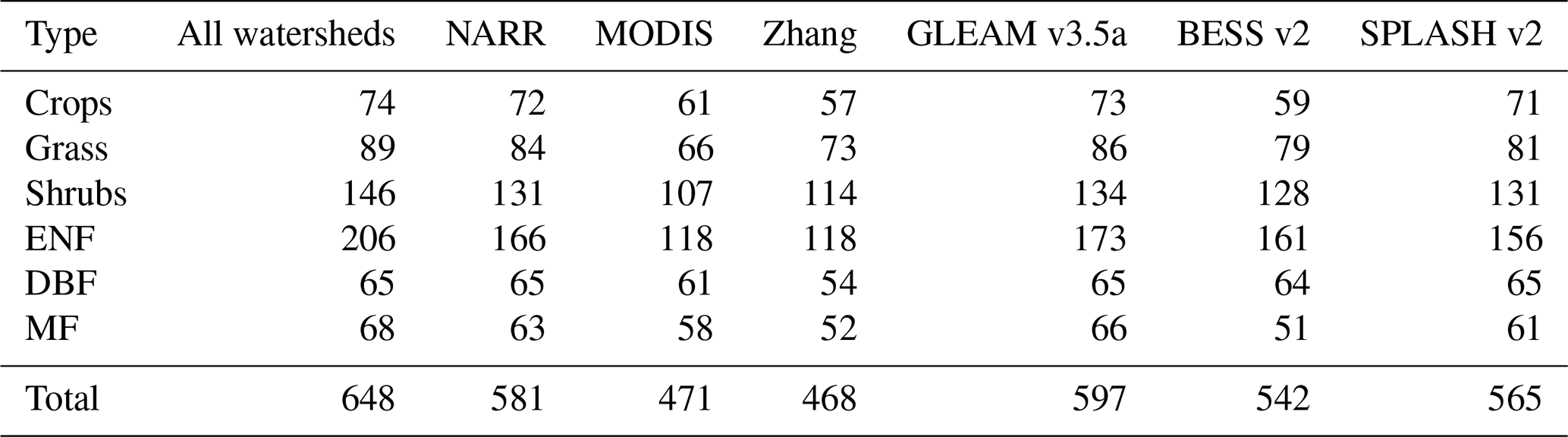 Table 2Number of filtered watersheds for each potential evapotranspiration (Ep) data product. Watersheds with less than 10 years of data and/or with Kling-Gupta efficiencies less than zero were removed from the analysis. Numbers are shown for each of the six vegetation types.