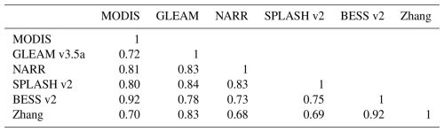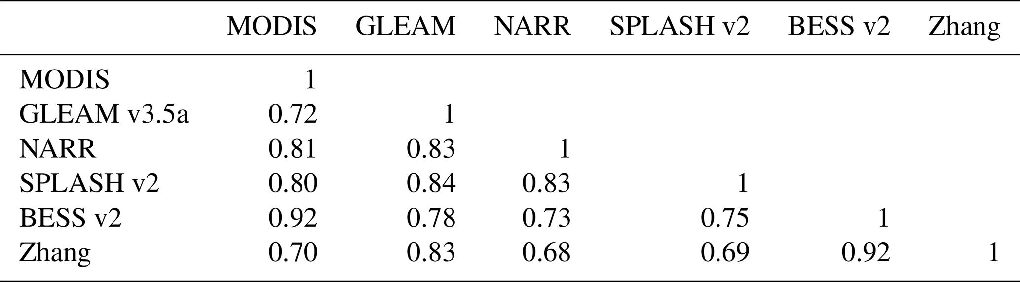 Table 3Correlations between rescaled Ep of six data products: NARR, MODIS, Zhang, GLEAM v3.5a, SPLASH v2, and BESS v2 for 648 watersheds.