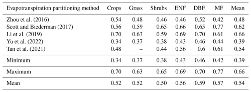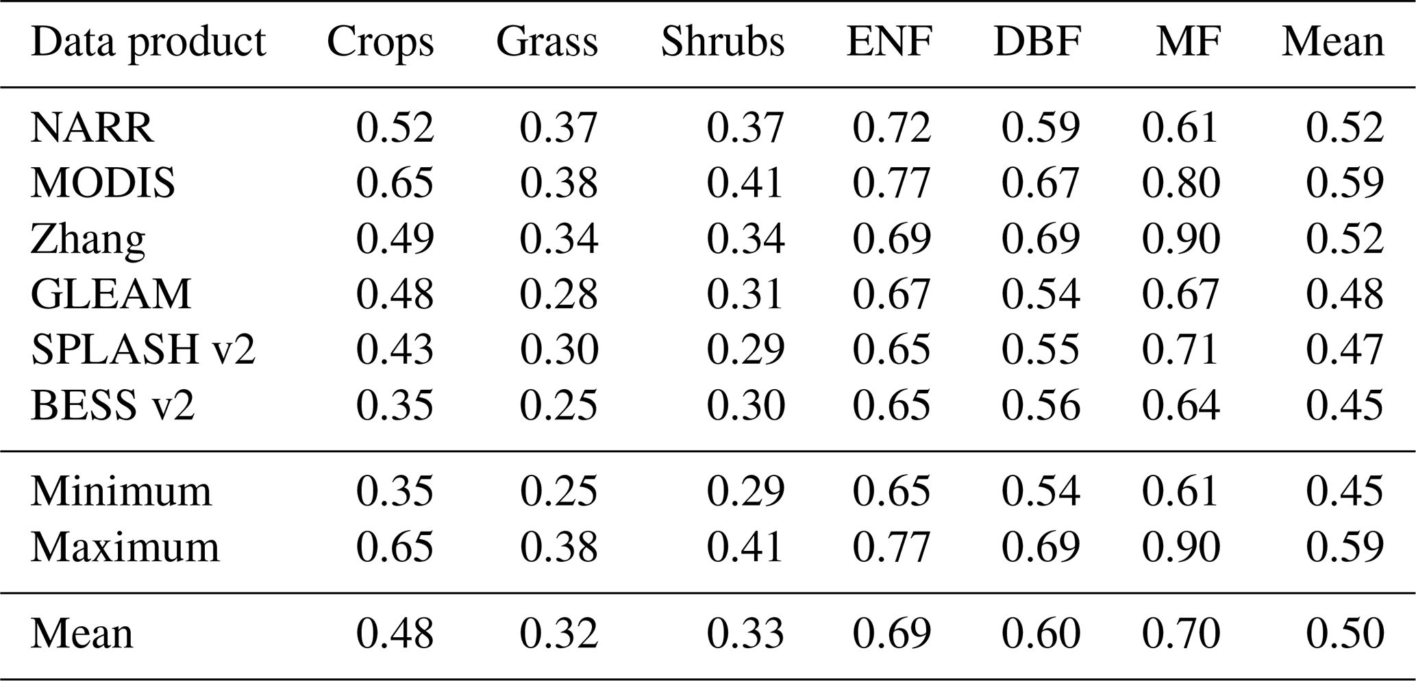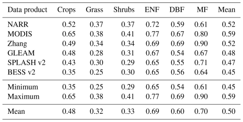 Table 4Mean Et/E values for six vegetation types using Ep data from the six data products. Minimum, maximum, and mean values are shown for each vegetation type.