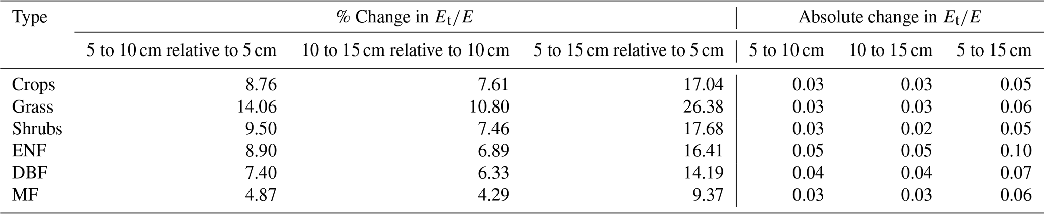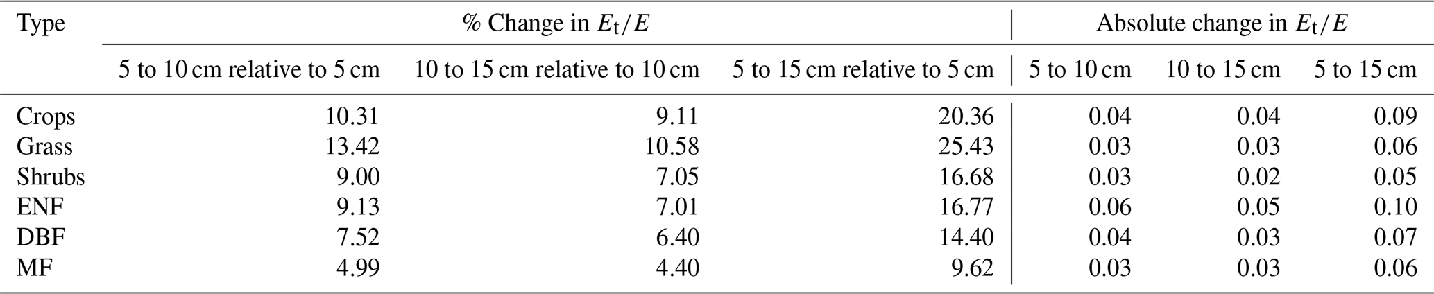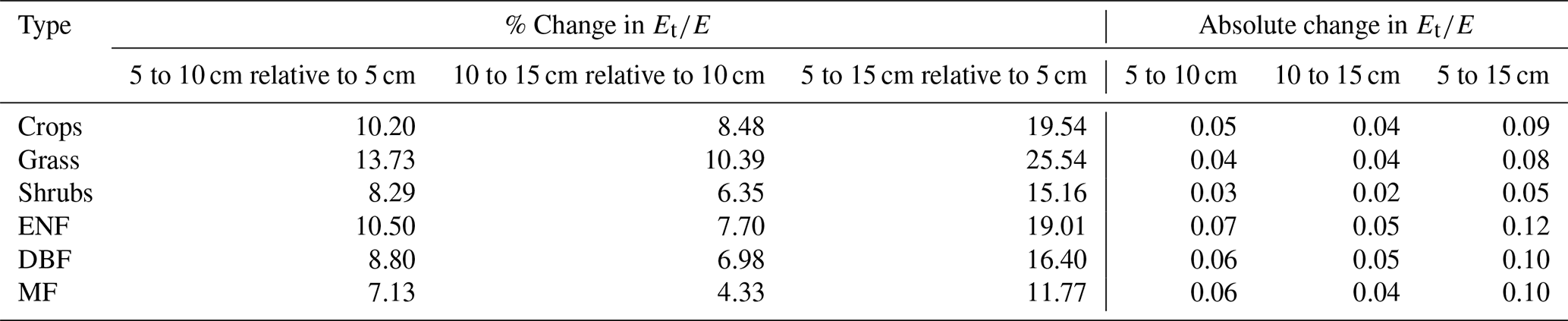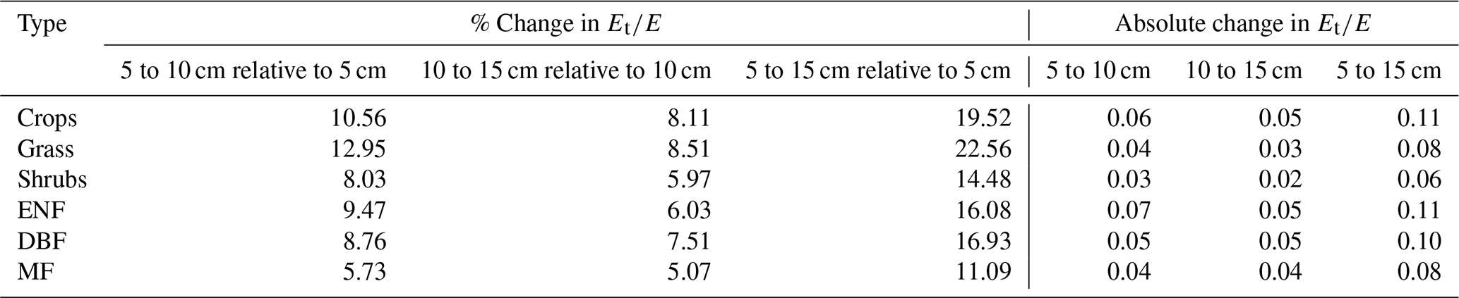 Table 5Relative and absolute change in mean Et/E values due to changes in fast transpiration depth. Results are shown as an average of the change in the six data products for each vegetation type.