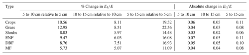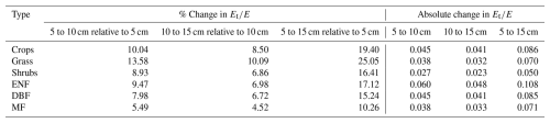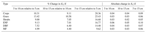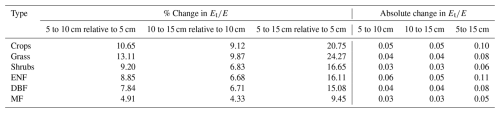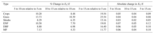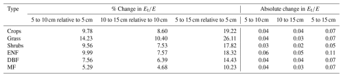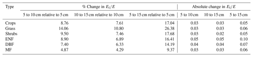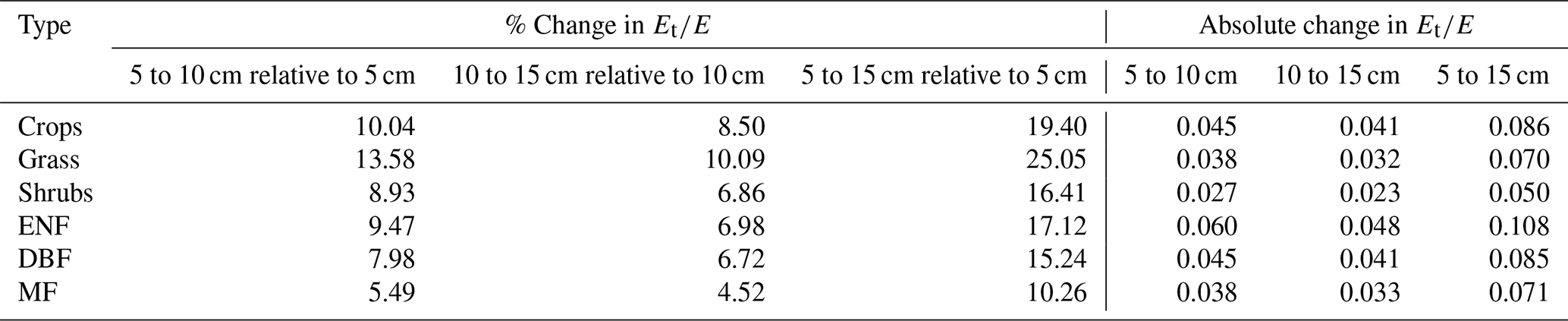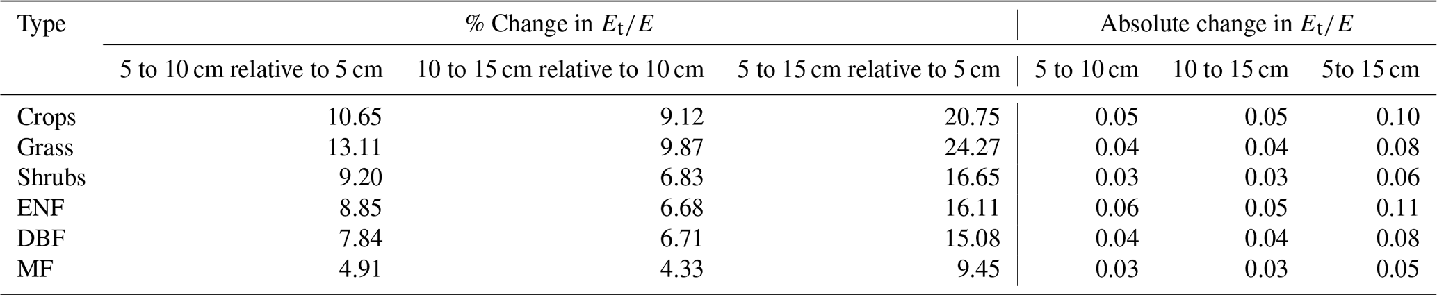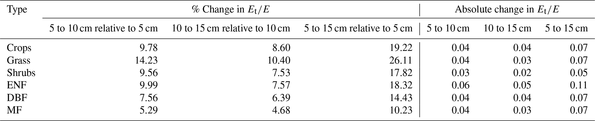 Table 5Relative and absolute change in mean Et/E values due to changes in fast transpiration depth. Results are shown as an average of the change in the six data products for each vegetation type.