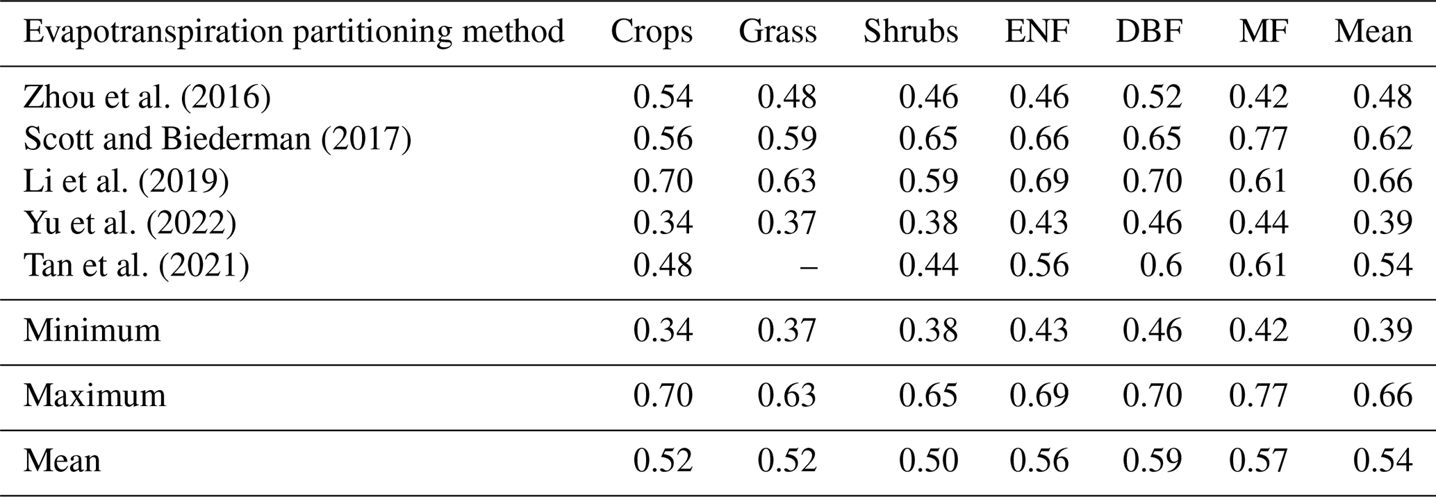 Zhou, S., Yu, B., Zhang, Y., Huang, Y., and Wang, G.: Partitioning evapotranspiration based on the concept of underlying water use efficiency, Water Resources Research, 52, 1160–1175, https://doi.org/10.1002/2015WR017766, 2016.