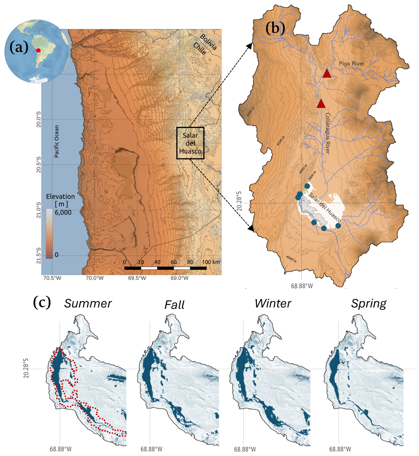 Figure 1(a) Geographic localization of the study area, the Salar del Huasco basin, in the Chilean Altiplano. Line contours indicate altitude levels every 250 m. (b) Zoomed-in view of the Salar del Huasco basin with the location of fluviometric stations in the Collacagua and Piga River (red triangles) and groundwater-fed springs (blue circles) that discharge to the salt flat nucleus at the basin's lowest point. Line contours are altitude levels every 50 m. (c) Seasonal fluctuations of the shallow, salty lagoon, located in the main wetland, during 2018. Red dotted lines in summer indicate lagoon extent in 2019, a year with above-average precipitation. Lagoon area was estimated based on Modified Normalized Difference Water Index (MNDWI) from Landsat data.