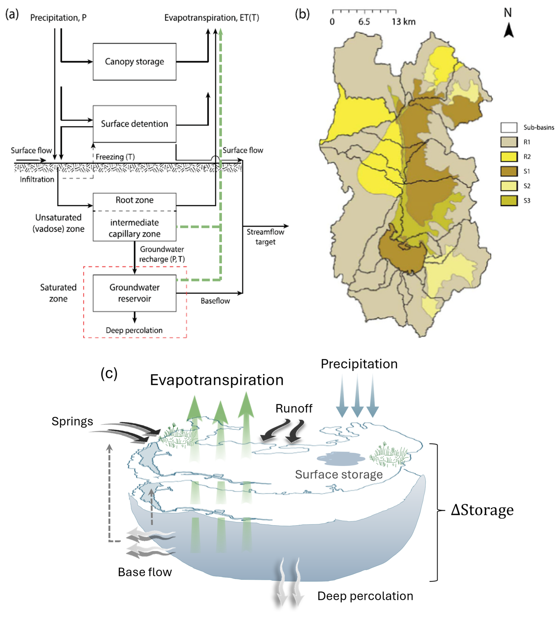 Figure 2(a) A schematic representation of the rainfall-runoff model reservoirs and the fluxes involved within each Hydrologic Response Unit (HRU) in the Salar del Huasco basin. For this study, we introduce explicit evaporation from the unsaturated zone and groundwater reservoirs (green arrows). (b) Model spatial domain composed of five HRUs and 21 sub-basins that contribute to the primary drainage network of the basin. (c) Schematic of water balance in the salt flat nucleus sub-basin, in which external springs flow, precipitation and runoff from neighbouring sub-basins represent the inflows to the salt flat nucleus, while evaporation and deep percolation represent the outflows. Since the salt flat nucleus is the lowest-point sub-basin, generated runoff represents accumulation in ponds, the lagoon or wetlands as surface storage, while base flow is recirculated groundwater that can either contribute to seepage or spring discharge. Panels (a) and (b) were modified from Blin et al. (2022).