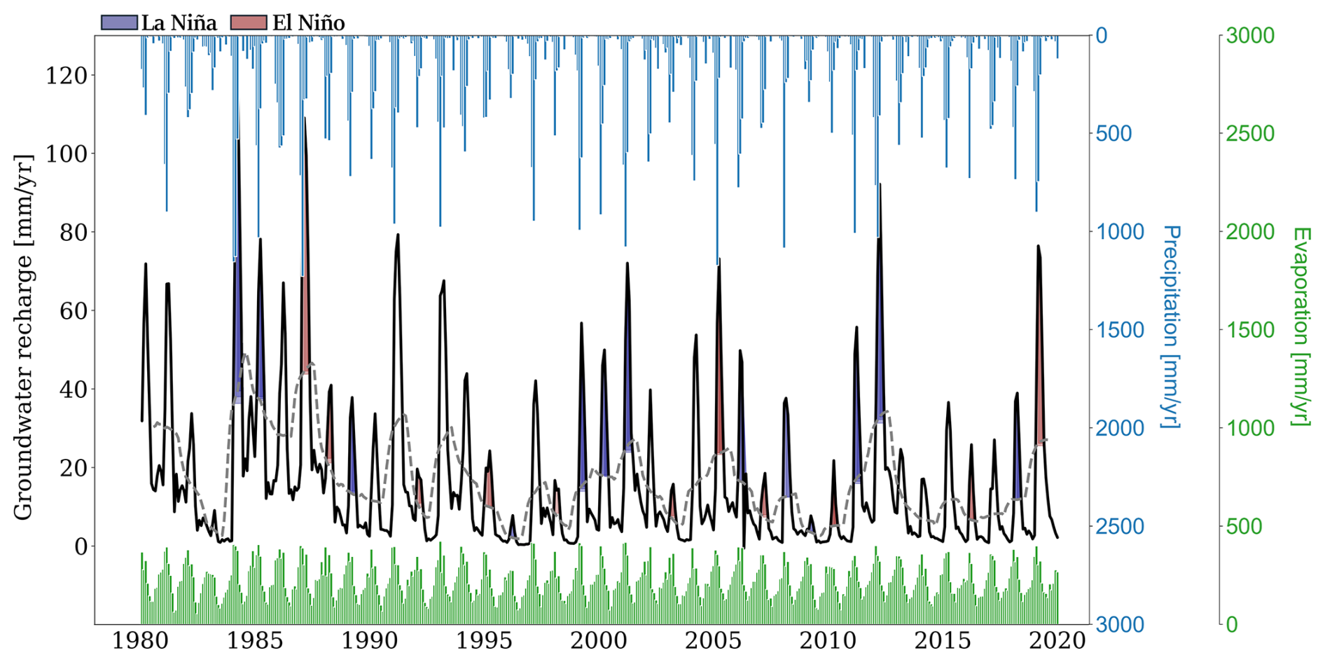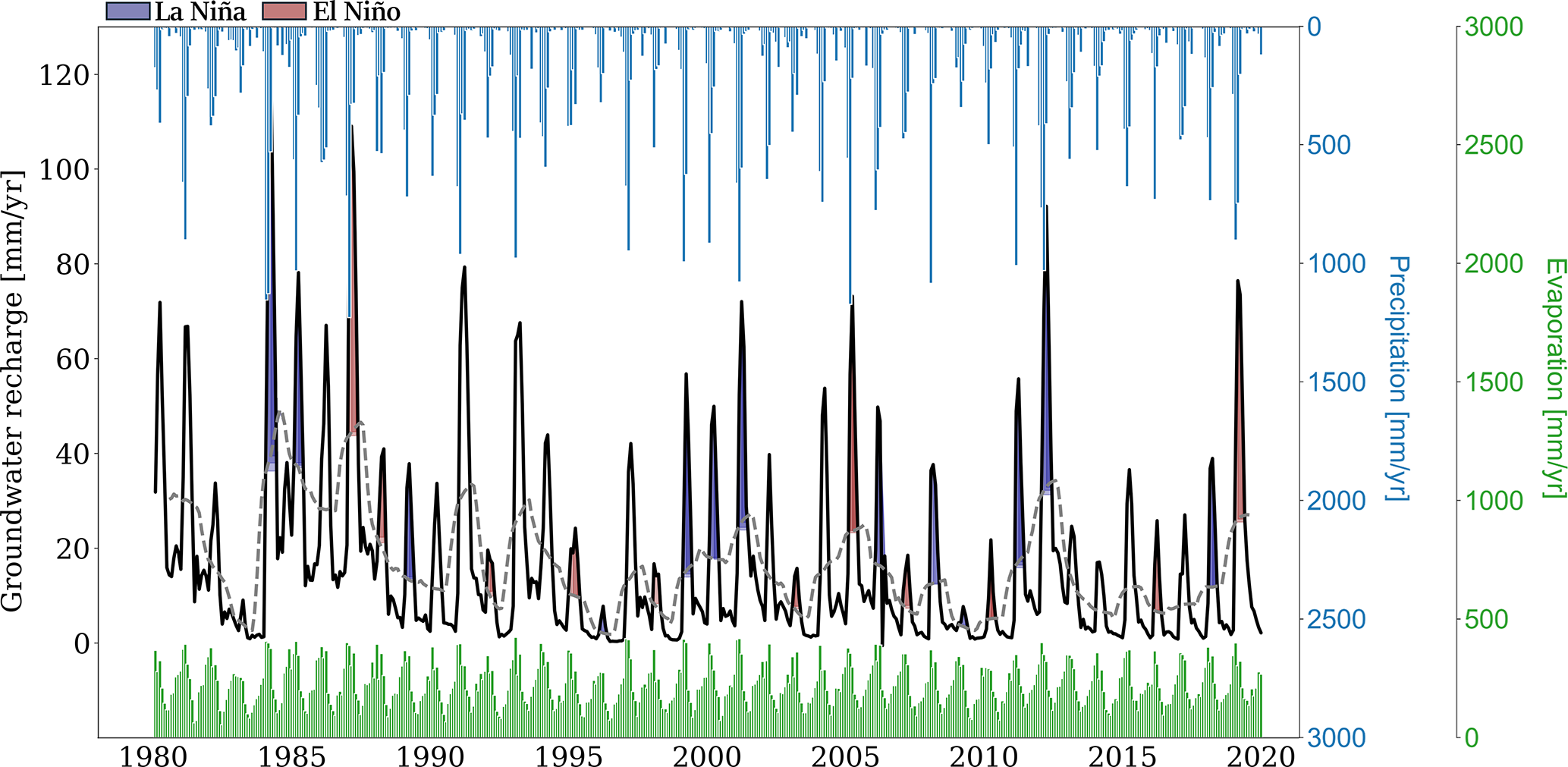Figure 3Groundwater recharge estimated for the Salar del Huasco basin using the Uribe et al. (2015) modified rainfall-runoff model. Values are presented for the 1980–2019 period and represent monthly means, scaled to annual equivalents (mm yr−1) for consistency across all water balance components. Groundwater recharge 12 month running average is displayed in grey dashed line. Blue shades correspond to La Niña years, while red shades correspond to El Niño years. Monthly averaged precipitation (blue bars) and evaporation (green bars) in mm yr−1 from gridded CR2MET and EEFLUX datasets, respectively, are also presented.