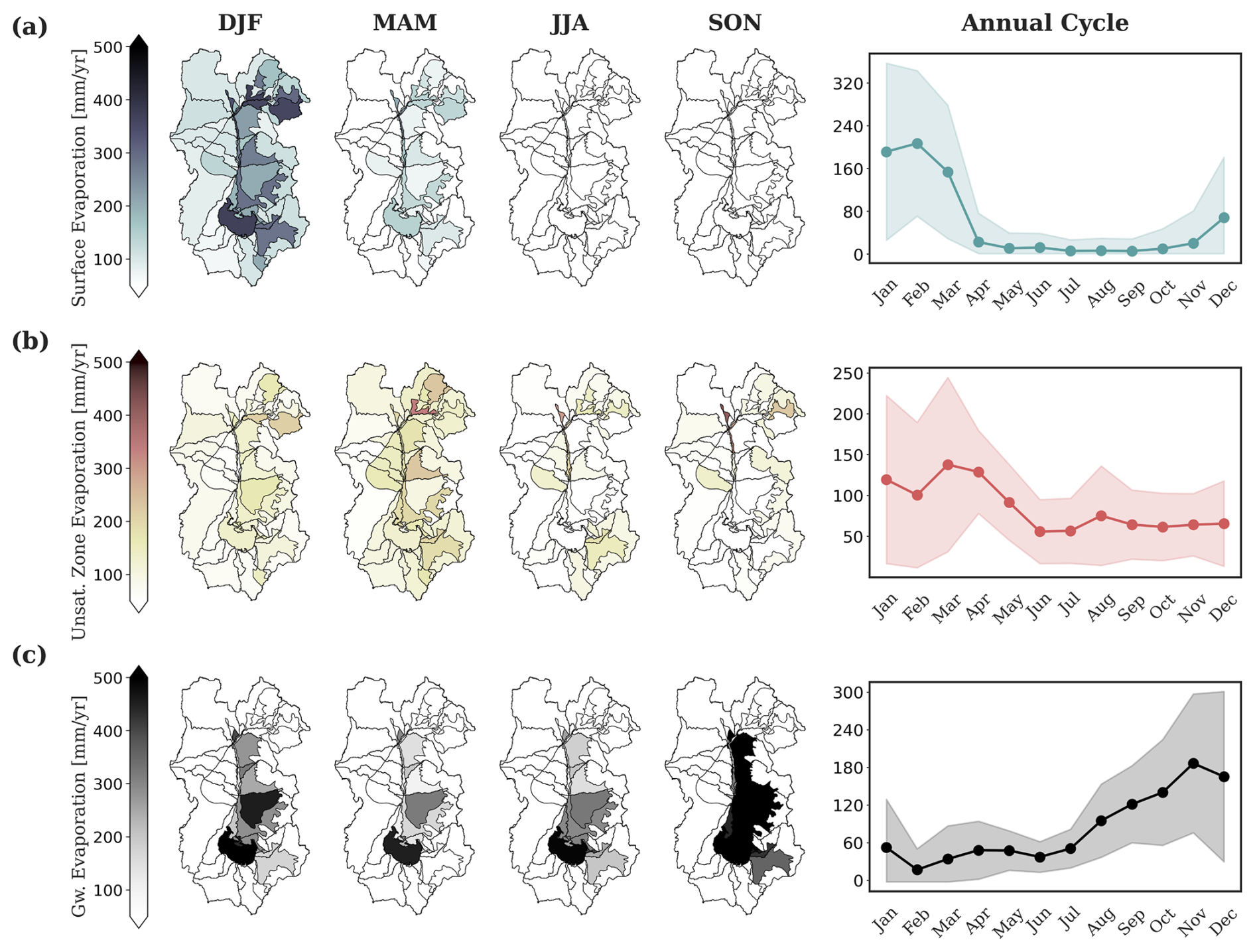 Figure 5Left panels: Spatial distribution of seasonal means across sub-basins in mm yr−1 for (from left to right) DJF, MAM, JJA, and SON for (a) Surface evaporation, (b) Unsaturated zone evaporation, and (c) Groundwater evaporation. Right panels: Monthly mean variability of each variable. Values represent monthly means, scaled to annual equivalents (mm yr−1) for consistency across all water balance components. Shades indicate the standard deviation.
