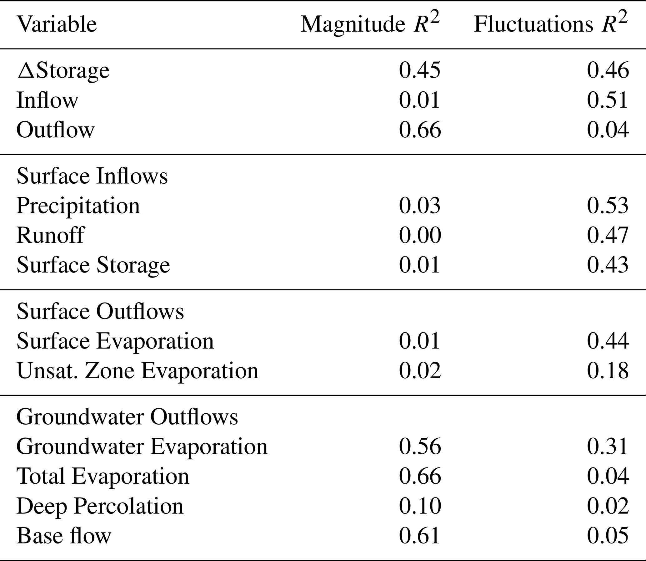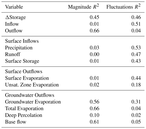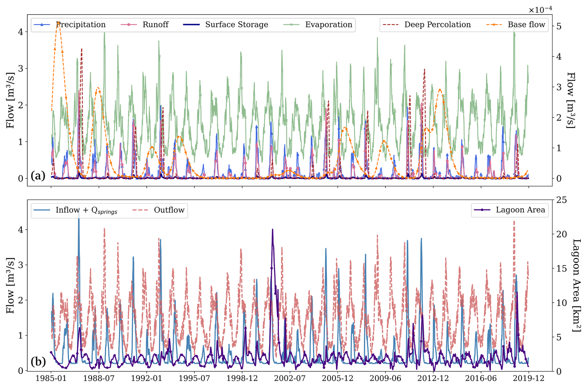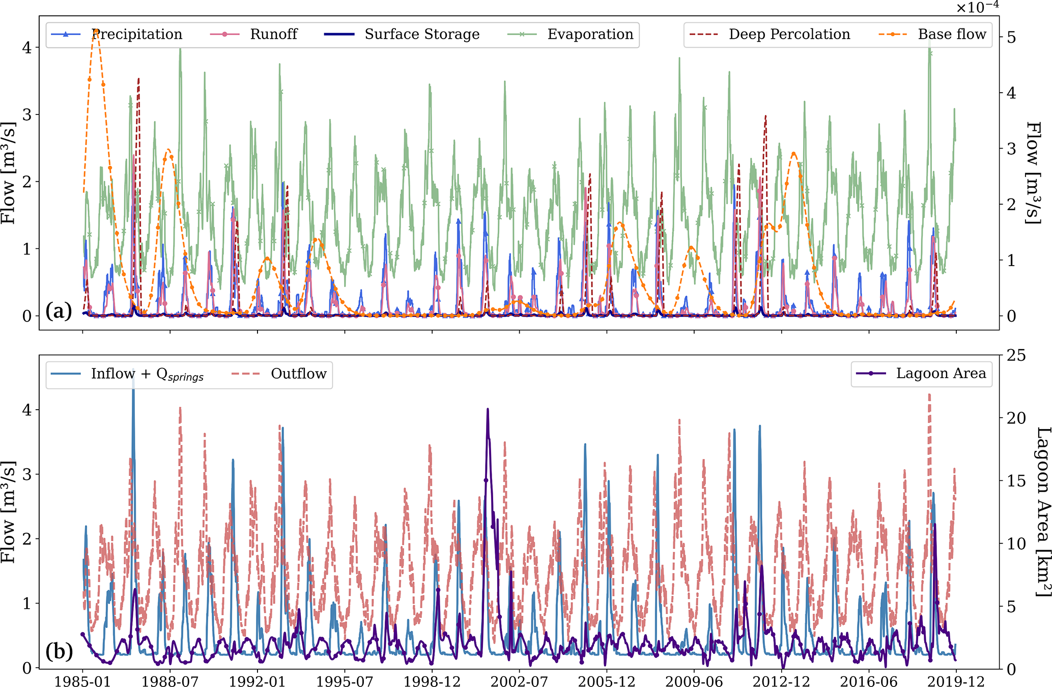 To further examine the relationship between the hydrological variables and lagoon area we estimated orthogonal regressions on monthly averages, distinguishing between magnitude (i.e. the longer-term or absolute area of the lagoon) and fluctuations (the shorter-term ups and downs). Table 1 shows that total inflow has a stronger correlation with lagoon-area fluctuations (R2=0.51) than with lagoon-area magnitude (R2=0.01). These results align with the idea that abrupt lagoon expansions respond to rainfall and runoff events, highlighting their influence on the lagoon short-term variability rather than long-term stability. Total outflow, instead, has a stronger correlation with area magnitude (R2=0.66). This is consistent with total evaporation (R2=0.66) driving the long-term water-level baseline that controls the lagoon area. Groundwater-related variables, particularly groundwater evaporation (R2=0.56) and base flow (R2=0.61), explain this strong correlation between outflow and lagoon area magnitude. These results underscore the role of subsurface flows in controlling overall water levels. In contrast, surface variables, both inflows and outflows, explain more of the short-term fluctuations, including precipitation (R2=0.53), runoff (R2=0.47), surface storage (R2=0.43), and surface evaporation (R2=0.44). These results also highlight the episodic influence of storm events, and their associated surface response, on the lagoon size. In short, these findings reveal two distinct timescales in lagoon behaviour, with short-term expansions governed by surface inflows and outflows, and longer-term persistence controlled by groundwater discharge and groundwater evaporation mechanisms.