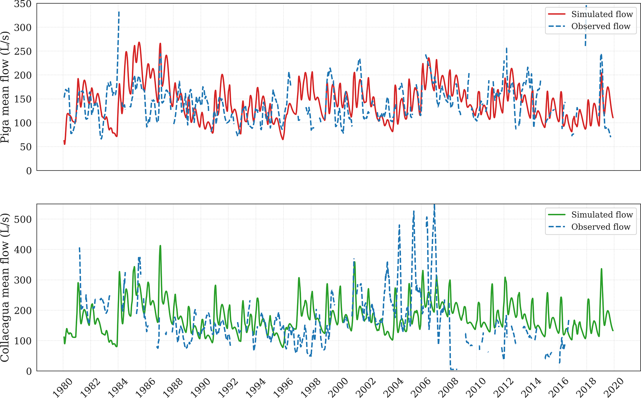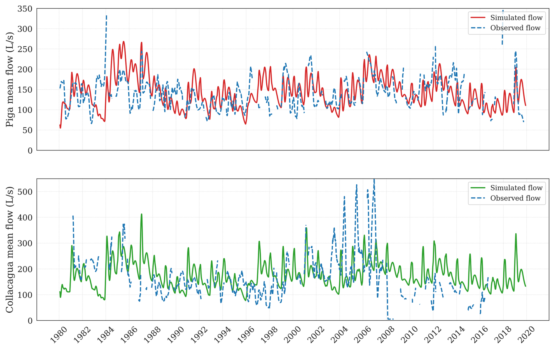 The modified rainfall-runoff model calibration was conducted using daily streamflow data from the Collacagua River and Piga River at Collacagua (DGA, Chile) for the analysed period (1980–2019). Uribe et al. (2015) performed a sensitivity analysis in which they identified five key parameters as the most influential on model performance: Percentage of soil infiltration (α), Maximum infiltration rate between the surface and the first soil layer (KDS), Storage capacity in the root zone (SVR), Storage capacity in the intermediate capillary zone (SVS), Storage capacity in the saturated zone (CASV). Only these five parameters were calibrated, while the remaining 10 parameters were assigned values from previous regional studies (DGA, 2009; Blin et al., 2022). Figure A1 shows the calibration results for Piga and Collacagua River.