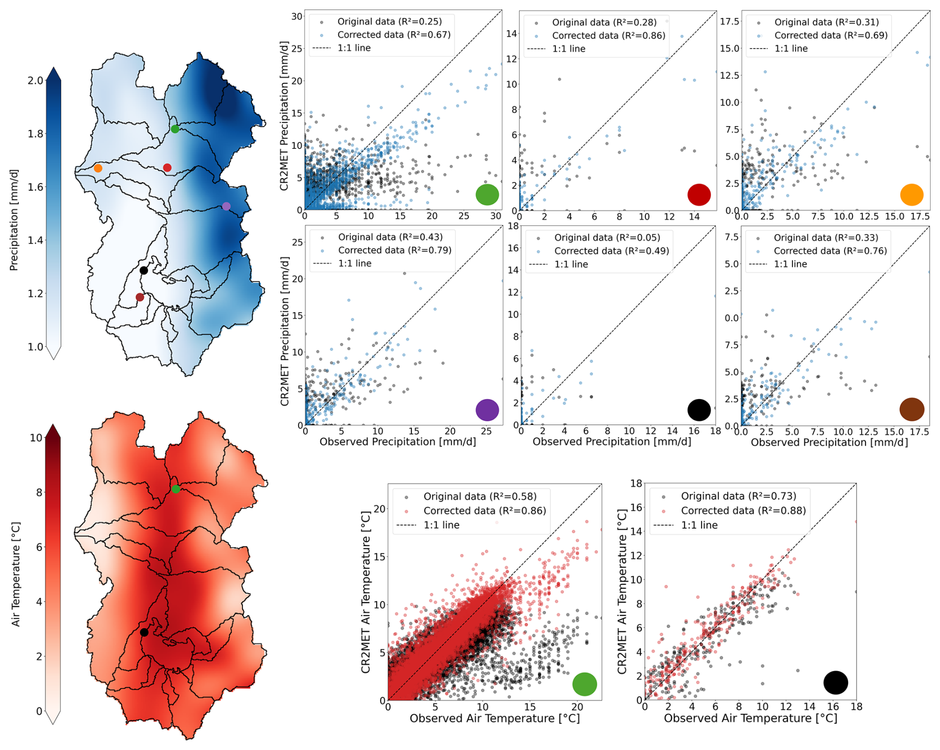 Figure B2Original (black dots) and corrected CR2MET data (blue dots for precipitation and red dots for air temperature) for the Salar del Huasco basin. A machine learning bias correction approach was implemented (Fig. B1).