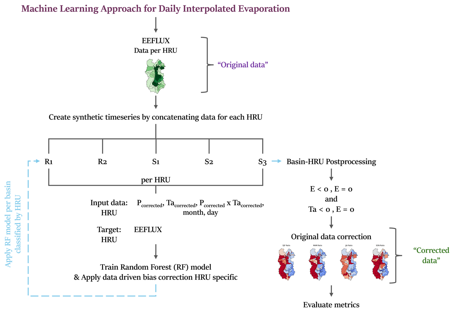 Non-linear relationships between evaporation drivers (e.g. rainfall, soil moisture, temperature) make machine learning an attractive tool to estimate evaporation compared to linear approaches, such as multiple linear regressions. To address the temporal resolution gap created by the 16 d Landsat cycle, we therefore applied a machine learning approach using CR2MET corrected precipitation and air temperature data (see Sect. B1). With this approach we also ensure consistency between the gridded datasets that are integrated in the rainfall-runoff model. Our methodological flow is summarised in Fig. B3.