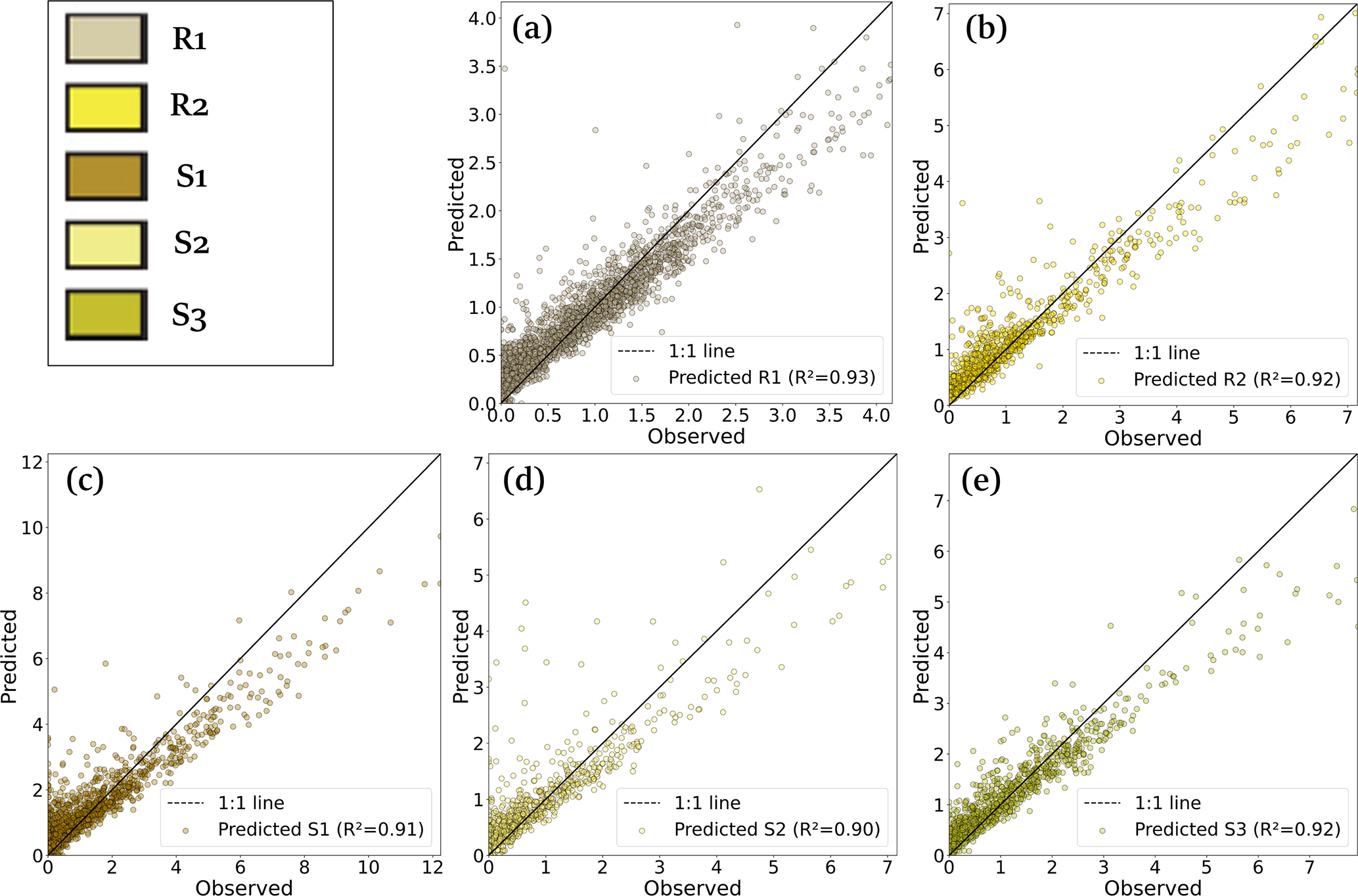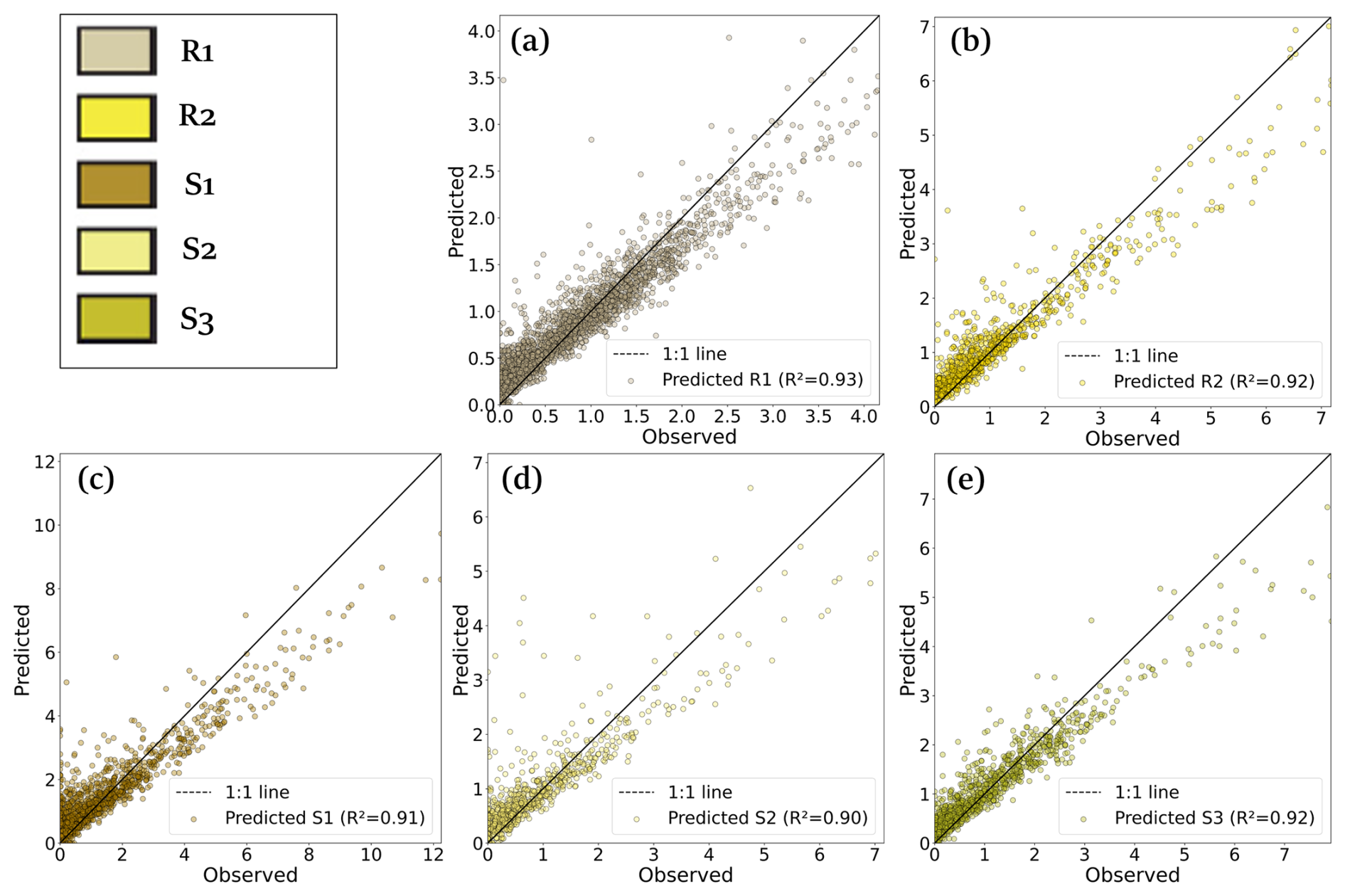 Figure B4Training results for daily interpolating EEFLUX evaporation data for each Hydrological Response Unit: (a) R1, (b) R2, (c) S1, (d) S2, and (e) S3.