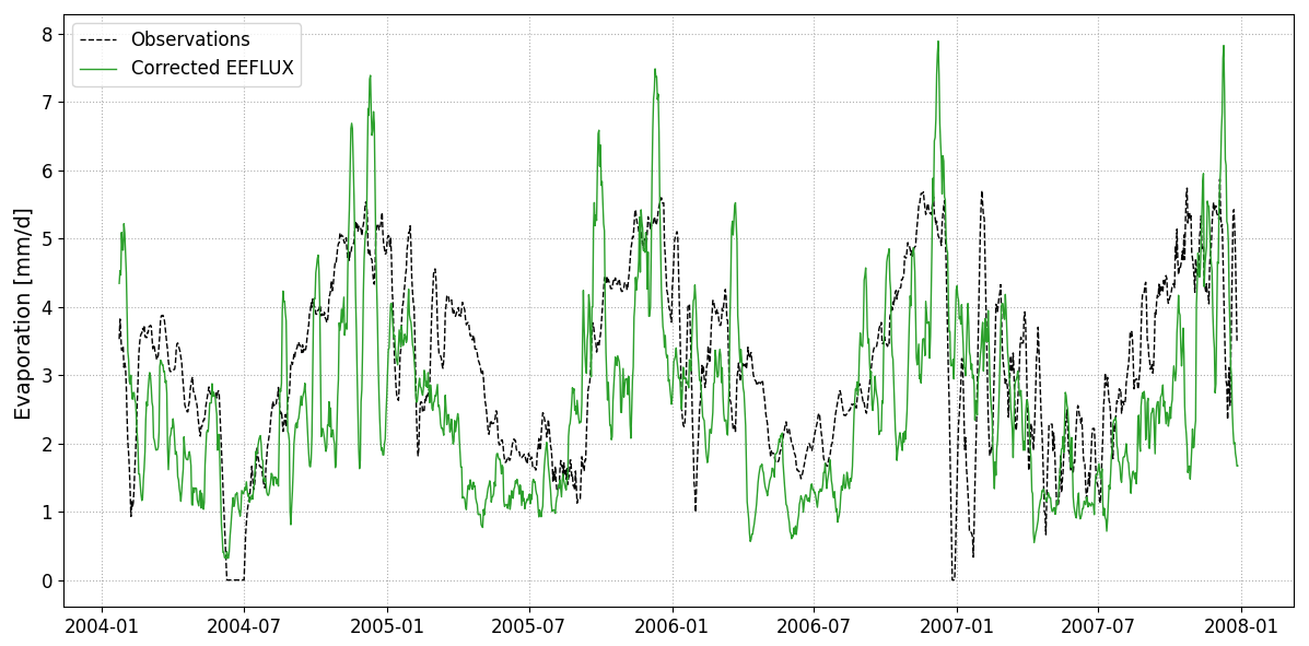 In this study, we implemented the Earth Engine Evapotranspiration Flux (EEFLUX) tool, which applies the Mapping EvapoTranspiration at high Resolution with Internalized Calibration (METRIC) model to Landsat images to produce 30 m-resolution evaporation estimates every ∼16 d (https://eeflux-level1.appspot.com/, last access: 2 December 2025). This high spatial resolution is especially advantageous in arid mountainous regions such as the Altiplano, where localised evaporation processes (e.g. from wetlands and shallow lagoons) can vary significantly over short distances (Blin et al., 2022; Lobos-Roco et al., 2021). Blin and Suárez (2023) used EEFLUX data as observations to calibrate a hydrogeological model developed for the Salar del Huasco basin, finding good agreement for desert, water and salt surfaces. Good EEFLUX performance was also found for other basins in the Atacama Desert, such as Silala basin, Putana river wetland, and salt surfaces and wetlands in Arica and Parinacota Region (see Figs. 5 and 6 in Blin and Suárez, 2023). However, while EEFLUX provides an opportunity to capture finer-scale features, its reliance on meteorological inputs and satellite-based surface temperature introduces uncertainties, particularly under cloudy conditions or where complex terrain can alter the energy balance (Allen et al., 2007). These uncertainties need to be taken into account when using EEFLUX estimates.