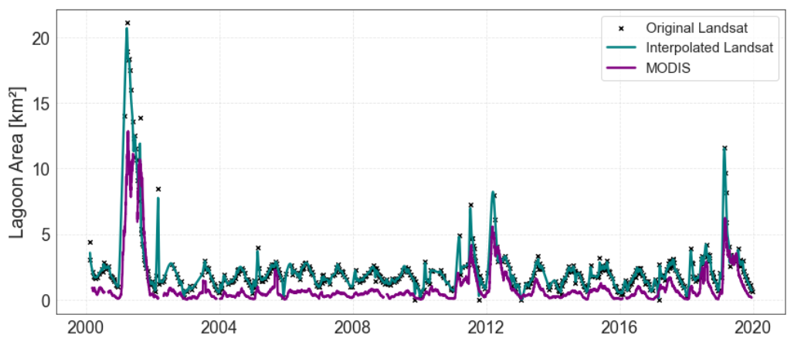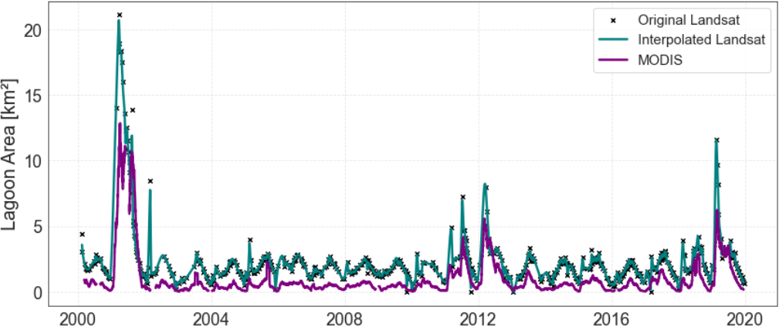 To generate a continuous daily time series, a piecewise cubic interpolation method was applied, ensuring smooth and realistic reconstruction of short-term variations while maintaining long-term trends. This approach effectively handled irregular temporal gaps due to cloud cover and due to temporal resolution (∼16 d). Note that, since our goal was to analyse how the lagoon's area fluctuates in response to precipitation variability, we did not use the machine learning approach proposed for evaporation (see previous section), as this would artificially introduce the relationship. The estimated lagoon extent was validated against MODIS-derived daily surface water observations, demonstrating similar temporal variability. We used the MODIS Terra Surface Reflectance dataset (MOD09GA v061 available from 2000 onwards) and applied the MNDWI with a threshold of ≥0.3, following a similar methodology to that used with the Landsat collections. Differences in absolute magnitude were attributed to the higher spatial resolution of Landsat, which provides more detailed water extent estimations.
