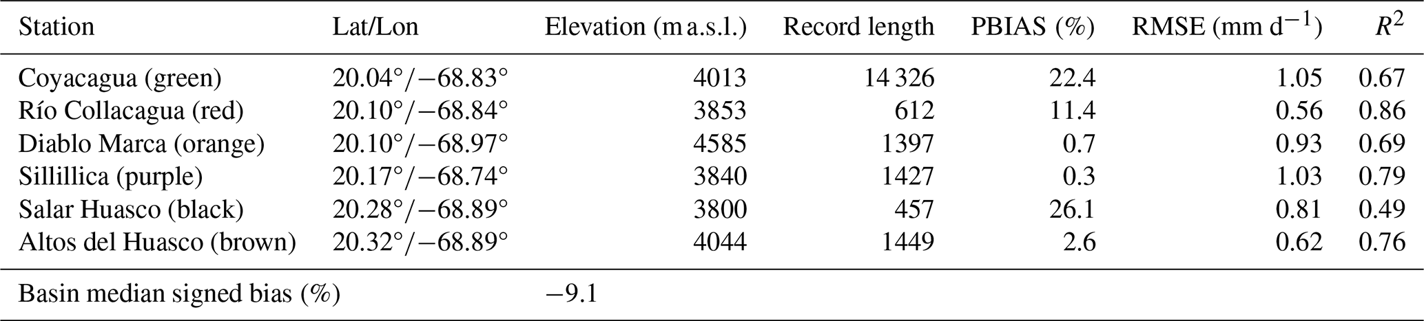 Table B1Summary of validation metrics for daily precipitation at DGA meteorological stations used for CR2MET bias correction. The colors in parentheses correspond to station markers in Fig. B2. PBIAS represents the percent bias computed for all days with recorded precipitation >1 mm, RMSE is the root mean square error, and R2 is the coefficient of determination. The basin median signed bias is derived from aggregating all station records into a single time series.