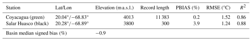Table B2Summary of validation metrics for daily air temperature at DGA meteorological stations used for CR2MET bias correction. The colors in parentheses correspond to station markers in Fig. B2. PBIAS represents the percent bias, RMSE is the root mean square error, and R2 is the coefficient of determination. The basin median signed bias is derived from aggregating all station records into a single time series.