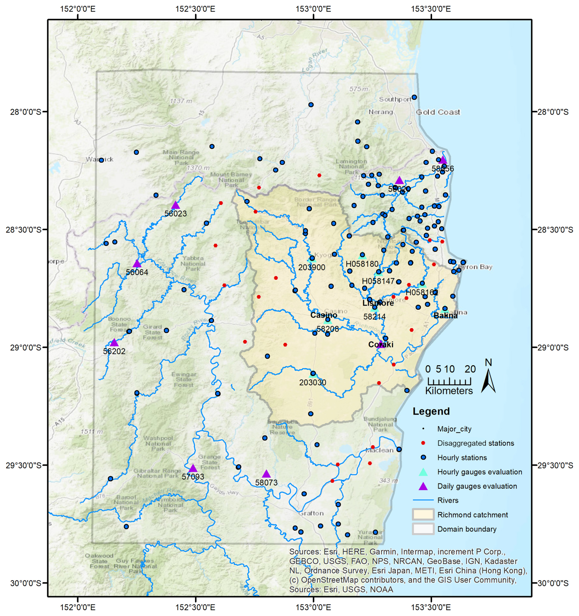 The annual rainfall in the catchment can exceed 1800 mm per year, with particularly high rainfall intensities observed in the north-east and coastal areas (Lerat et al., 2022). Due to the combination of the topographic and climate conditions, the Richmond River catchment is prone to extreme and devastating floods. There were 17 major flood events from 1945 to 2022, with a maximum daily rainfall of more than 60 mm d−1 (Lerat et al., 2022). The severe floods in 2017 (1 in 21 Annual Exceedance Probability, AEP) and 2022 (the largest observed flood event in the catchment on record) overtopped the levee at Lismore, causing loss of lives and serious damages to businesses and properties. Having a more precise representation of the rainfall data in the Richmond River catchment is essential for reliable flood modelling and mitigation in the region. The analysis was done for an area (30 389 km2) as shown in Fig. 1, which is larger than the Richmond River catchment area, to adequately support the hourly rainfall interpolation along the catchment boundaries.
