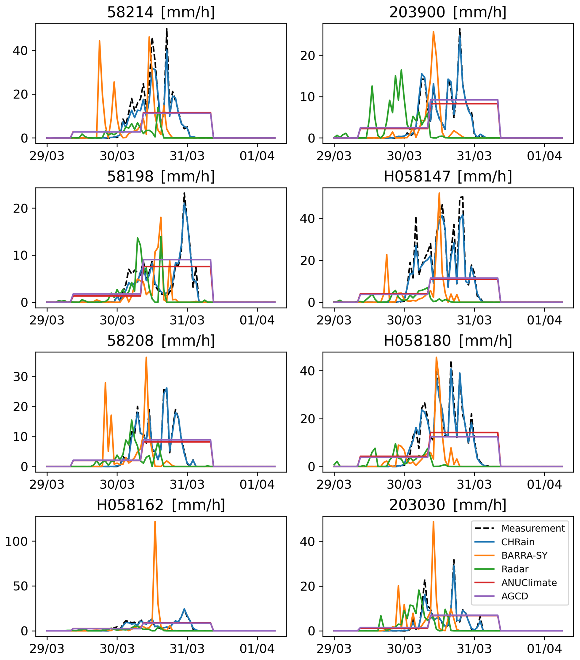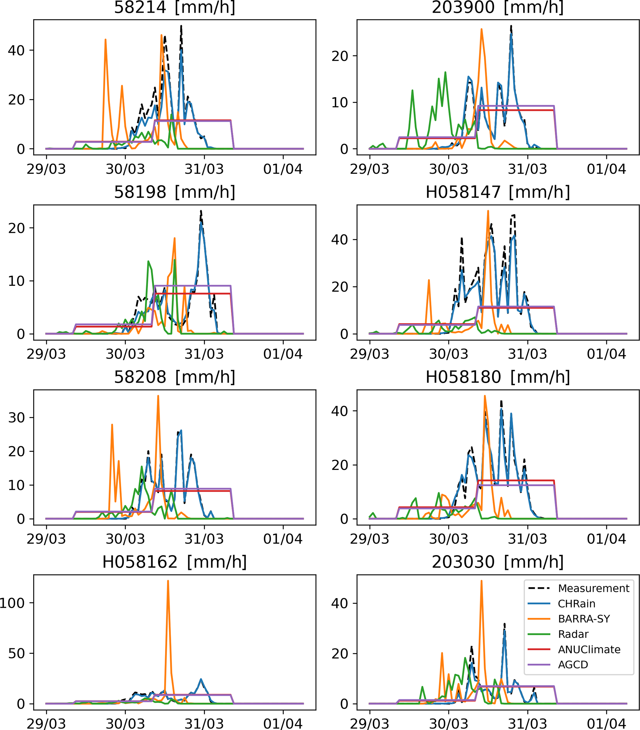 In our analysis, we used the daily and hourly point rainfall measurements to interpolate the rainfall surfaces and to generate the gridded datasets. In areas where the distribution of hourly gauges is coarse, the rainfall data at nearby daily gauges were disaggregated to hourly (by using the hourly patterns from the neighbouring hourly stations and radar images to determine the rain front movement) for the spline interpolation. Gridded rainfall datasets, including the radar, BARRA data for the eastern New South Wales (BARRA-SY), ANUClimate, and AGCD datasets, were used in the evaluation and comparison with our results from CHRain (Table 1).
