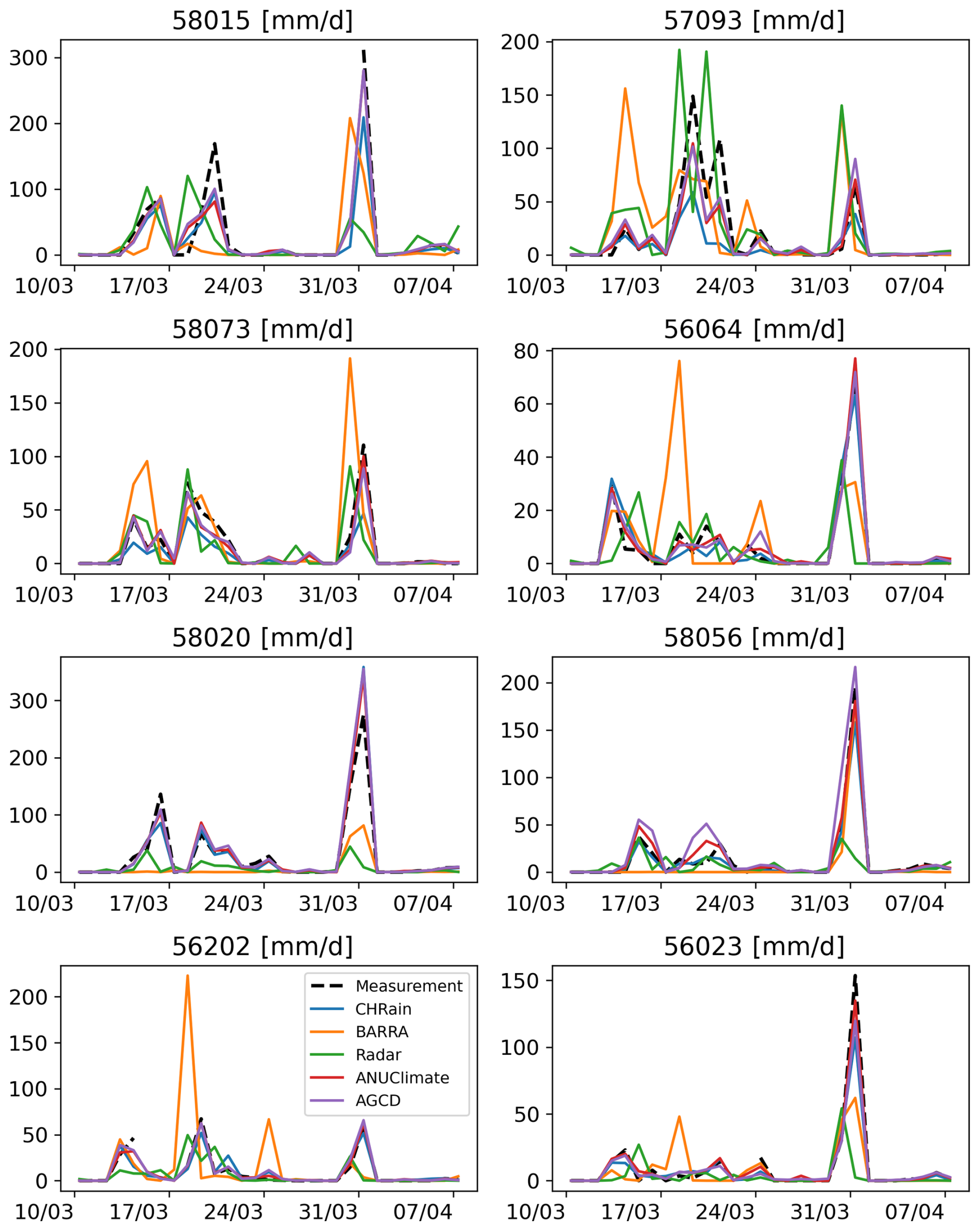 In the temporal evaluation, we compared the time series extracted from gridded rainfall data, including CHRain, BARRA-SY, radar, ANUClimate, and AGCD datasets to the point measurements. Because all of the hourly gauges were included in the generation of the CHRain dataset, we evaluated the CHRain with the daily measurements at 169 gauges, that were not used in the interpolation. We selected 8 hourly stations to undertake further analysis, shown as blue triangles in Fig. 1. The 8 gauges are located in the important cities and towns within the Richmond Rivers catchment, including Lismore, Casino, Ballina, Kyogle, Channon, and Nimbin. These areas were affected significantly during the flood events in 2017 and 2022. The ANUClimate and AGCD daily values were disaggregated evenly from 9:00 am the previous day to 8:00 am the current day to generate the hourly time series. A similar comparison was conducted for the daily time series, extracted from 8 daily stations (shown as purple triangles in Fig. 1). These daily stations were not used in generating the CHRain splines. The hourly CHRain, BARRA-SY, and radar data were aggregated from 9:00 am the previous day to 8:00 am the current day to produce the daily datasets to compare with ANUClimate and AGCD data.