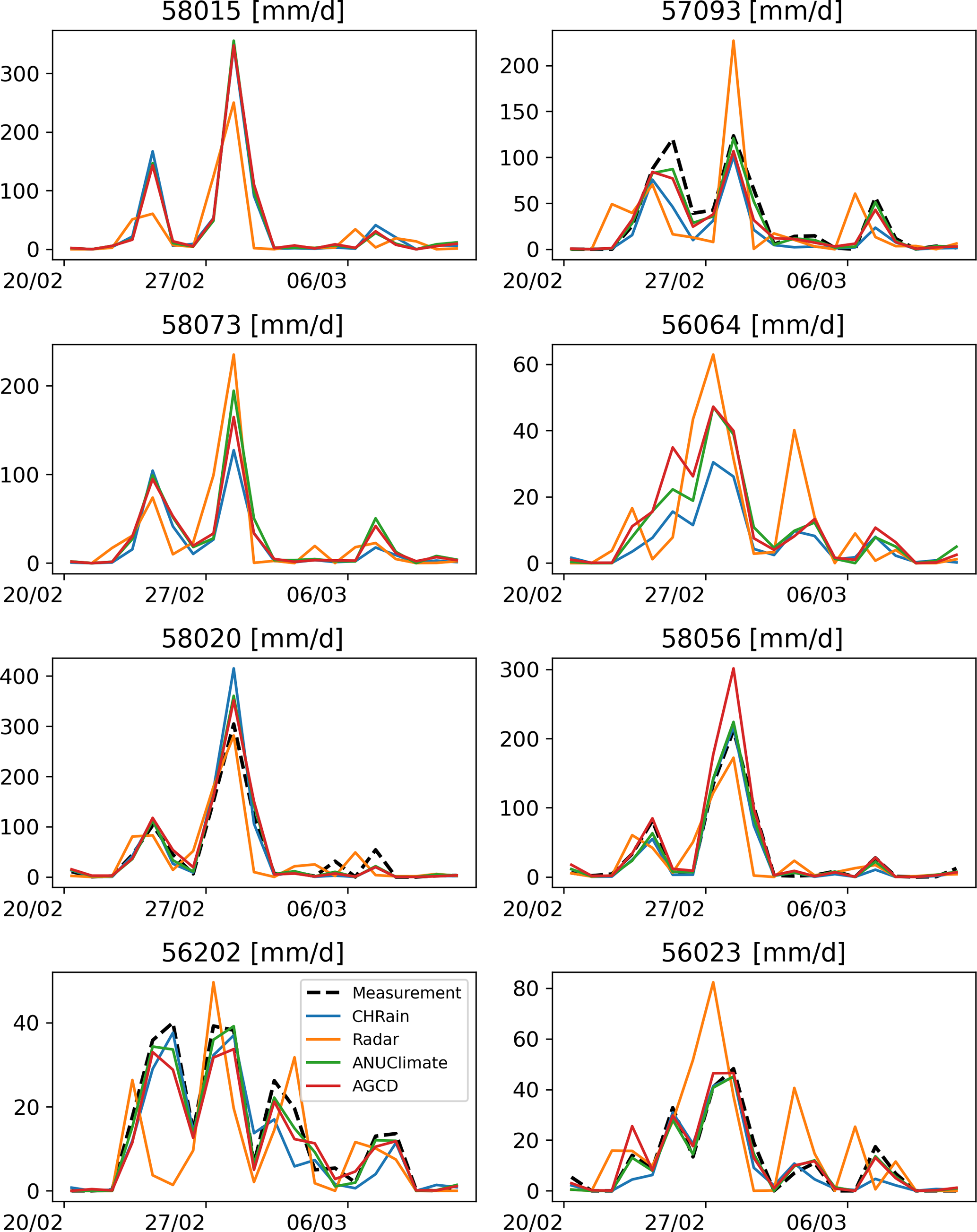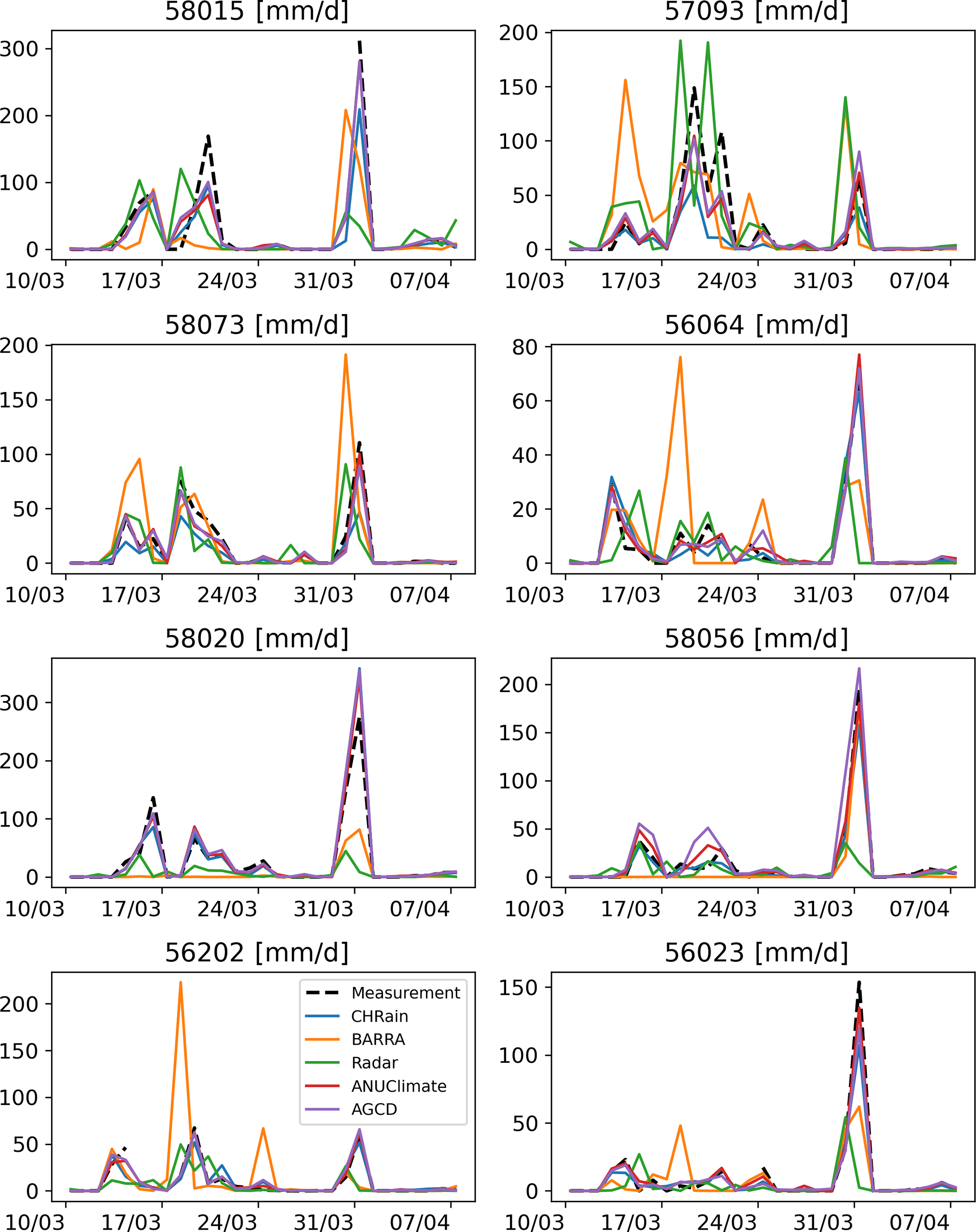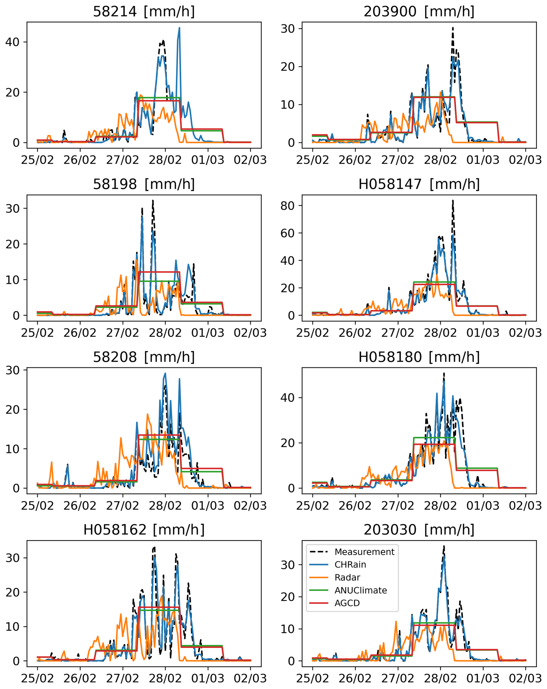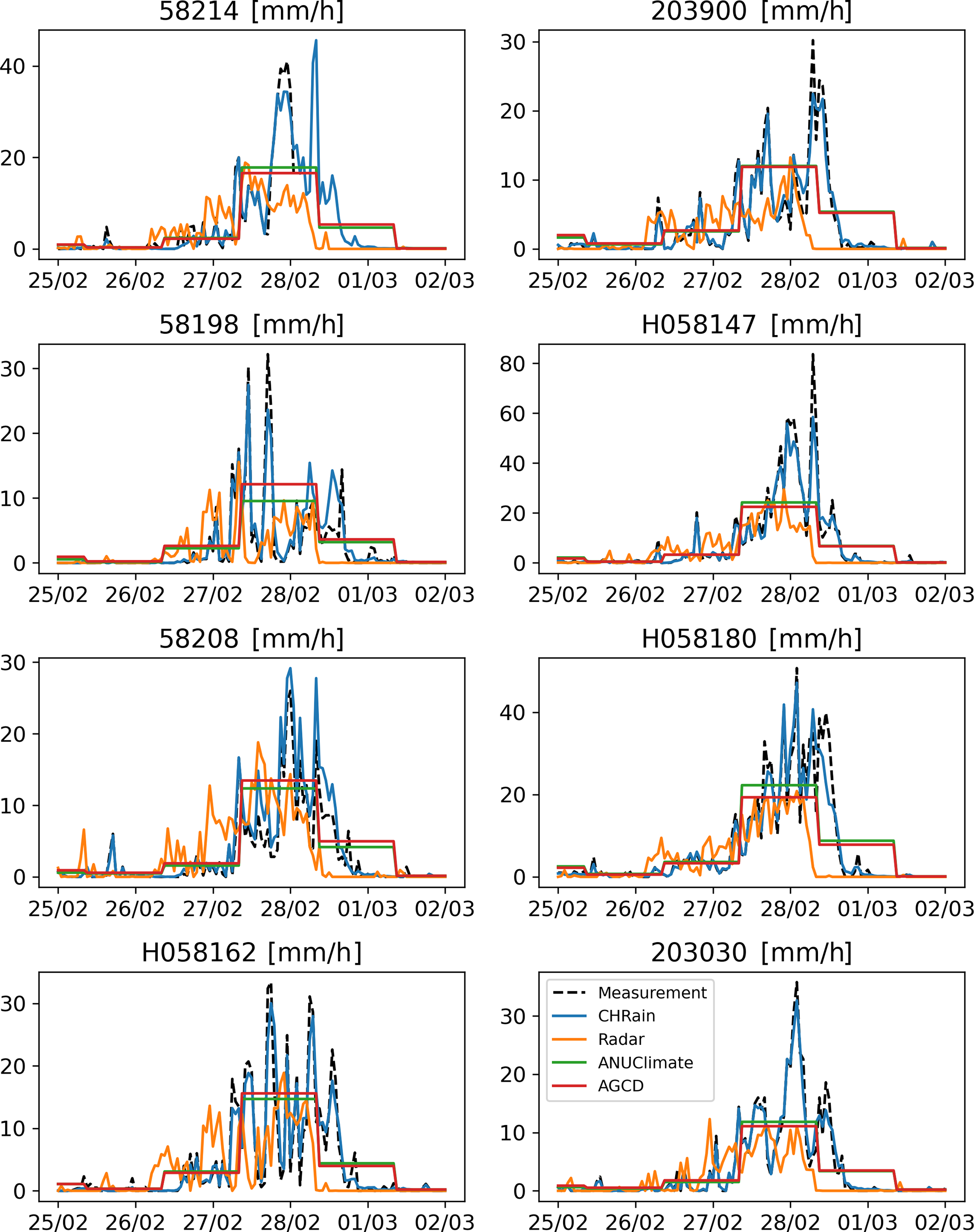 In the spatial analyses, we compared the hourly CHRain with the ANUClimate and AGCD datasets. The hourly CHRain data were summed to generate 24 h total surfaces, from 9:00 am the previous day to 8:00 am the current day.